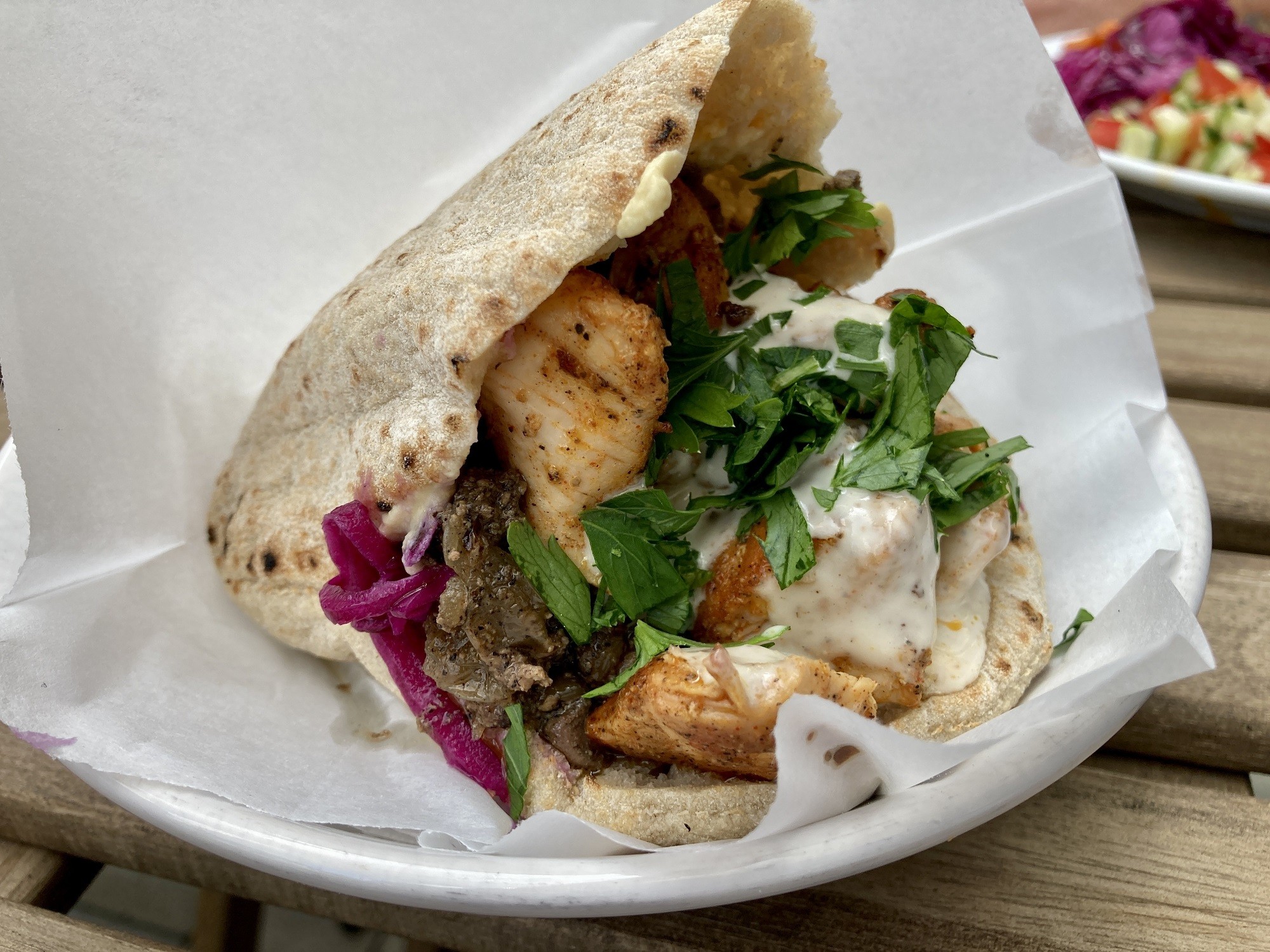 Keď sme si prečítali, čo obsahuje Jeruzalemský mix (4,80 €), tak túto kombináciu sme museli vyskúšať! Kto si však myslí, že dostane klasický pita chlieb, je na omyle. Prinesú vám hrubšiu rozkrojenú placku, vnútri ktorej je náplň vpasovaná ako po poschodiach. Naspodu je humus, na ňom kuracie mäsko a ako toping kuracie pečienky restované na cibuľke. Takže sme sa postupne prekúsavali rôznymi zaujímavými chuťami, od najťažšej prílohy po najľahšiu, a celkový dojem ostal skvelý. Keď sme jedlo vzali do ruky, už jeho hmotnosť naznačovala že bude veľmi sýte. Ale nakoniec sa dalo zvládnuť a pomer cena - výkon nabral nový rozmer.