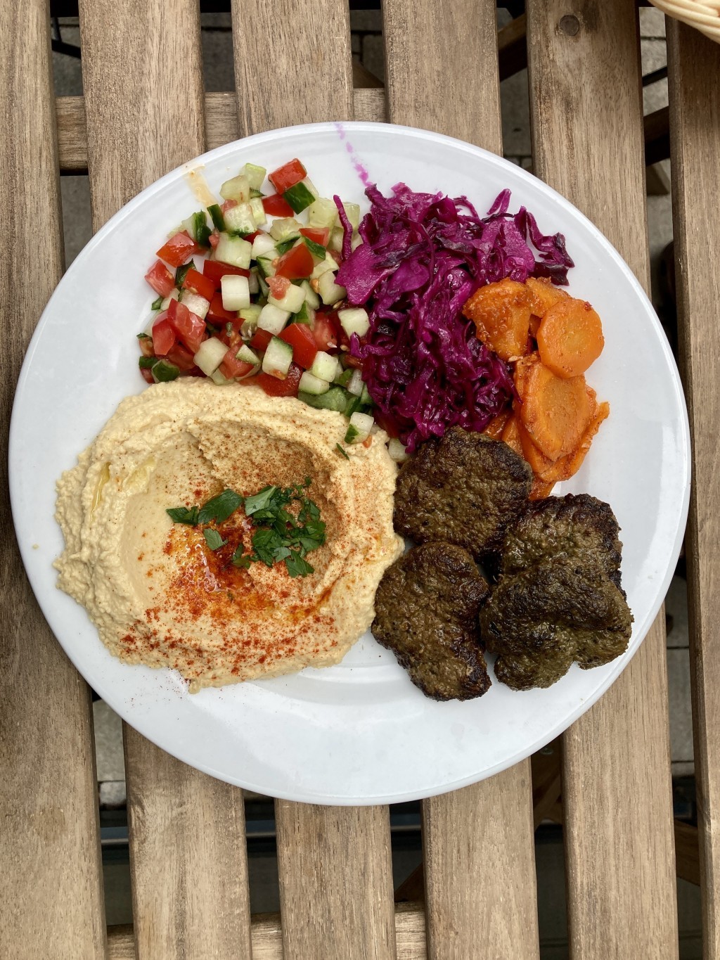 Aj Hummus s kebabom (8,30 €) môže prekvapiť. Nečakajte nič, čo sa podobá tureckému döner kebabu či gréckemu gyrosu. K bezchybnému hummusu vám priložia štyri hovädzie fašírky z domáceho grilu, ktorý im zaručí nezameniteľnú chuť. A keď si toto jedlo objednáte ako menu, čo sme urobili, pridajú vám na tanier aj mix čerstvého arabského šalátu, kyslej kapusty a krúžkov marockej mrkvy. Výsledkom je kombinácia pestrých chutí, ktoré sa zaujímavo dopĺňajú.