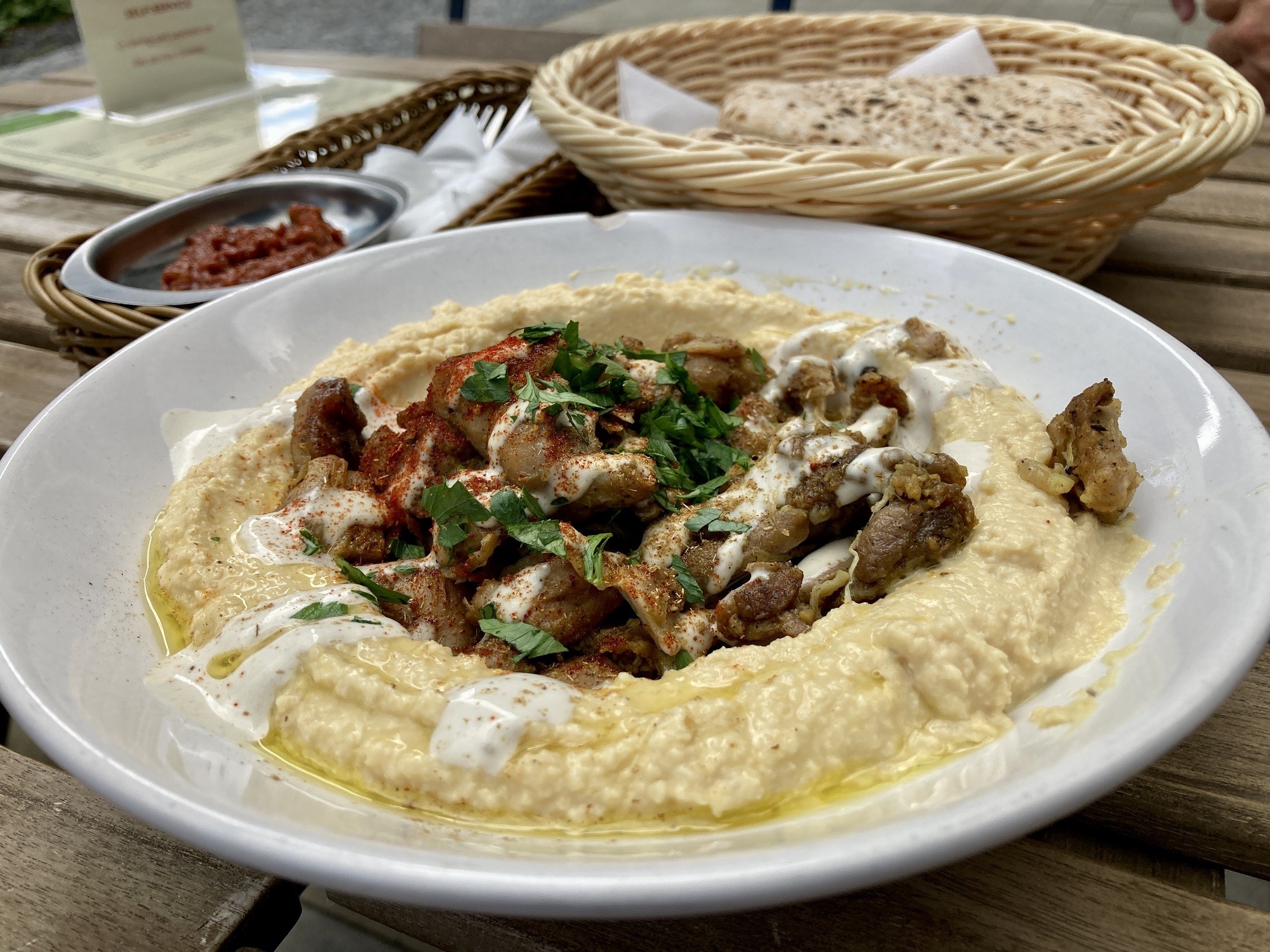 Na ďalší tanier sme si objednali Hummus so shawarmou, čo sú grilované kúsky marinovaných kuracích stehien (7,80 €). Konzistencia aj dochutenie hummusu boli vynikajúce, jednoznačne patrí v rámci Bratislavy medzi najlepšie. Ani mäsu sme nemali čo vyčítať, prepečené akurát, chuť lahodná. Ak si však zvyknete objednávať hummus shawarmu aj v iných bratislavských prevádzkach, čakajte jeden rozdiel. V Hummusbare na Pribinovej dostanete presne to, čo uvádza jedálny lístok, teda najmä samotný hummus, kuracie kúsky a dozdobenie koreninami, ako prílohu ešte pikantnú omáčku a pita chlieb, ktorý si pečú sami. Nie však bohaté zeleninové obloženie, na ktoré ste možno zvyknutí z iných reštaurácií.