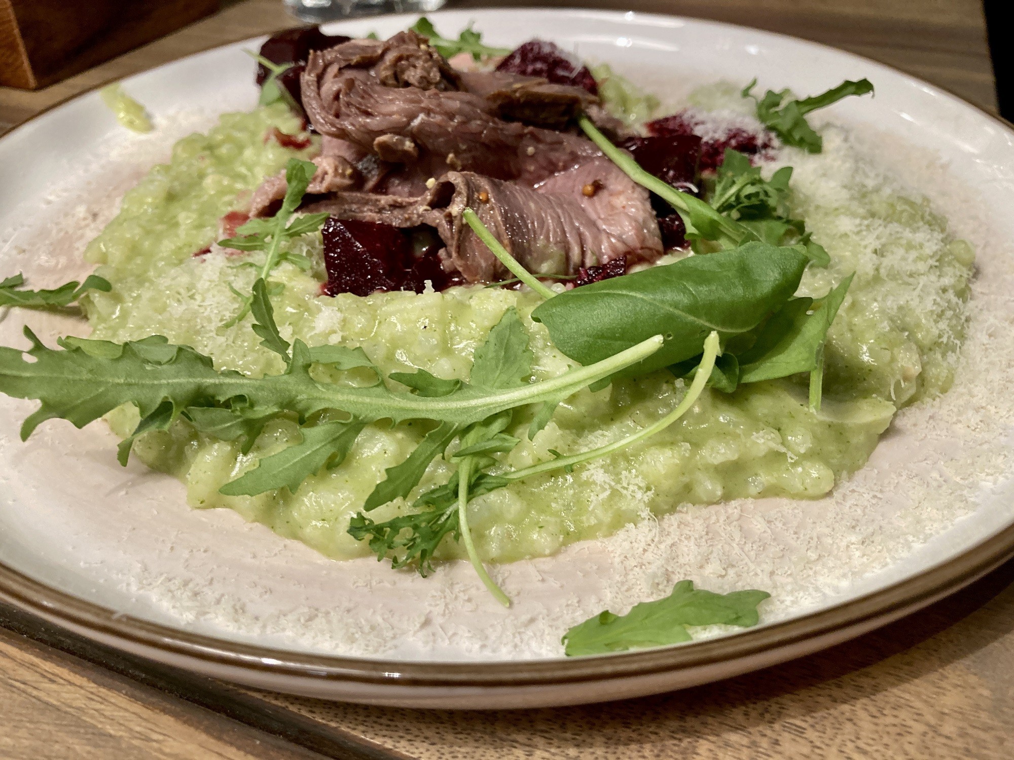 Ľahké Rukolové rizoto (8,90 €) chutilo presne tak, ako má chutiť pravé talianske rizoto. Bolo jemne krémové, zážitkom boli aj natenko narezané plátky marinovaného hovädzieho rozbifu. Slanšiu chuť mäska zaujímavo dopĺňali sladkasté kúsky červenej repy, rukola a strúhaný parmezán.