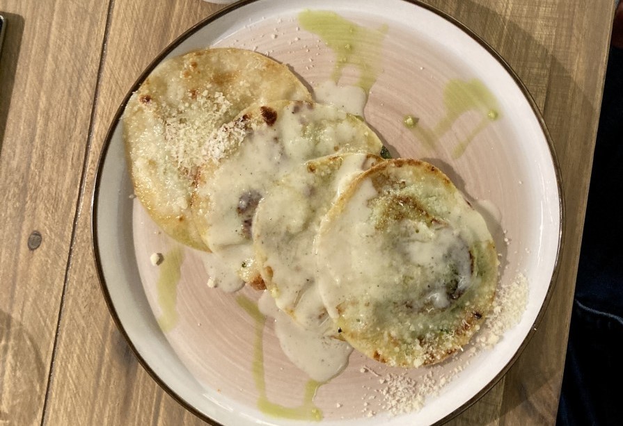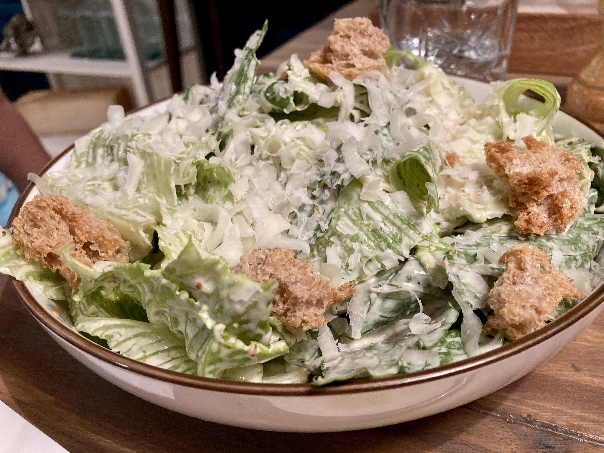Ak si objednáte Cézar šalát (7,00 €), dostanete obrovskú porciu trhaného rímskeho šalátu, ktorý podávajú s poctivým cézar dresingom, hoblinami parmezánu a bylinkovými krutónmi z kváskového chlebíka. Šalát bol lahodný, šťavnatý, no z dresingu by sme predsa len trochu ubrali. Naopak, parmezánu by sme prijali viac ako len na ozdobu, samozrejme, je to vec chuti. K zelenému tanieru sme si navyše dopriali Grilované kukuričné kuriatko (3,50 €). Chrumkavé plátky mäska boli výborne ochutené, doslova skvostné.