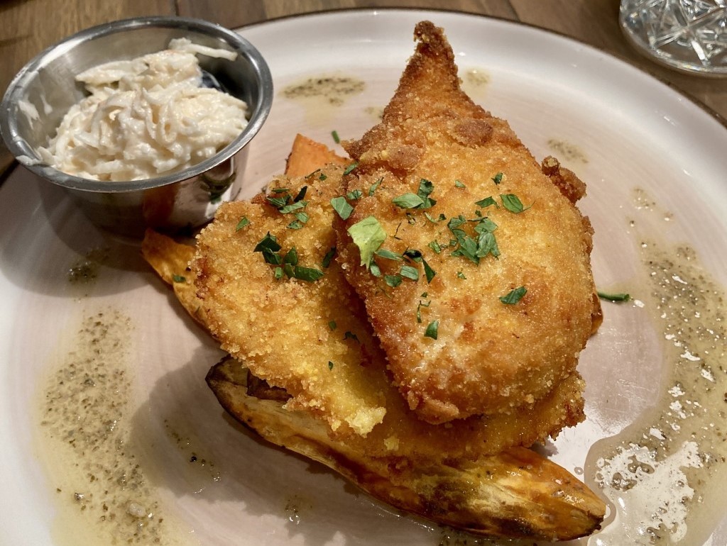 Zo zvedavosti sme ochutnali aj Vyprážané kukuričné kuracie prsia (7,90 €) s pečenými batatmi s bylinkami, oživené omáčkou zo zeleného korenia a sviežim šalátom. Naozaj to nebola úplná klasika. Mäsko bolo chutné a šťavnaté a obal z kukuričnej strúhanky jemný, čo pokladáme za veľké pozitívum. Nečakane príjemným prekvapením bol tiež smotanový šalátik z hrozna a zeleru. Celkový dojem dotváralo štýlové servírovanie, takže najedli sa aj oči.