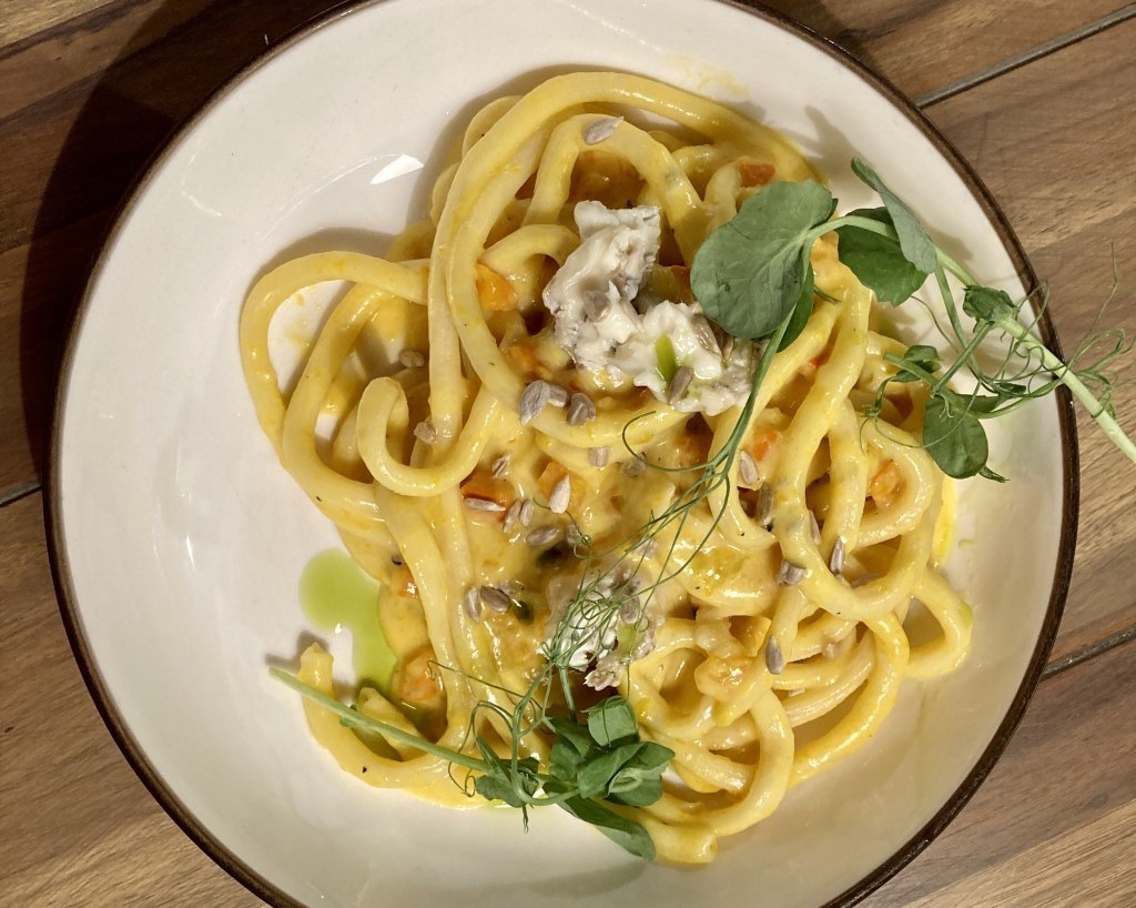 Bucatini s krémovou omáčkou z pečenej tekvice.