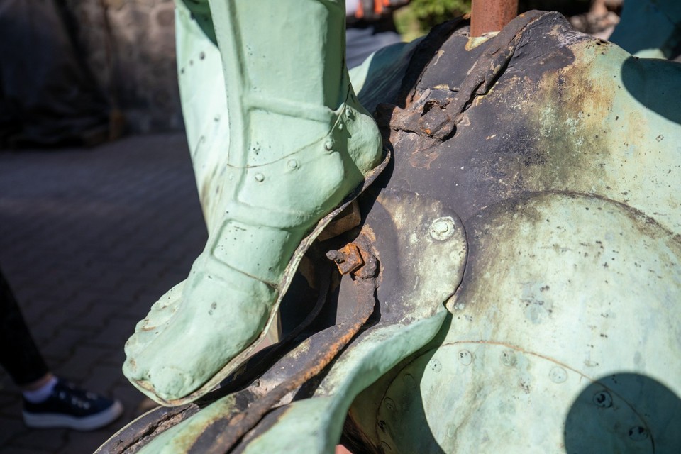Mali sme šťastie že sme stihli sochu v pozícii, v akej bola na veži, čaká ju totiž demontáž. Reštaurátor ju pritiahol na vozíku až do stredu dvora, takže sme si ju mohli poobzerať zo všetkých strán. Ak ste nemohli zájsť na spomínanú výstavu v Starej radnici, pozrite si fotografie v našej galérii nižšie alebo naše video: