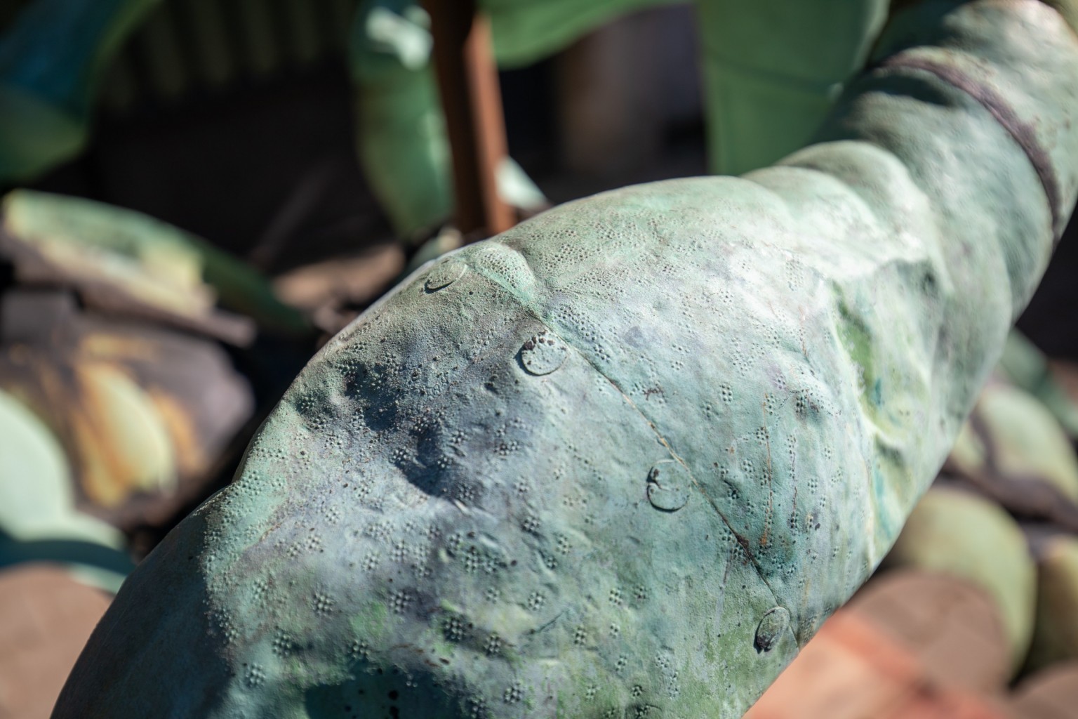 „Plastika je tepaná z veľmi tenkej medi, nameral som hrúbku len od 0,5 do 2 mm, je to taká dutá škrupinka. Aby zvládla silný nápor vetra v 50-metrovej výške Michalskej veže, vnútri má konštrukciu z kovaného železa, ktorá prechádza až von. Navrhnem ju vymeniť, pretože na viacerých miestach koroduje, nie je stabilná,“ pokračuje Stanislav Kožela.