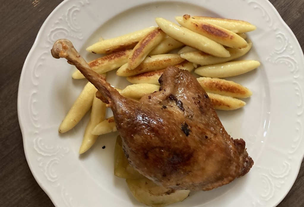 Pečené husacie stehno (15,99 €) pripravujú na karamelizovaných jablkách so škoricou a voňavým badiánom. Malým prekvapením boli pre nás opekané zemiakové šúľance ako príloha. Mäsko bolo prepečené pekne do chrumkava, mäkučké a príjemne slané. Túto lahôdku chuťovo dotiahli jabĺčka, bez ktorých by to nebolo celkom ono. Šúľance sú osobitná kapitola, boli veľmi jemné a chutné, bavilo nás poobracať ich v husacej masti a potom vložiť do úst.