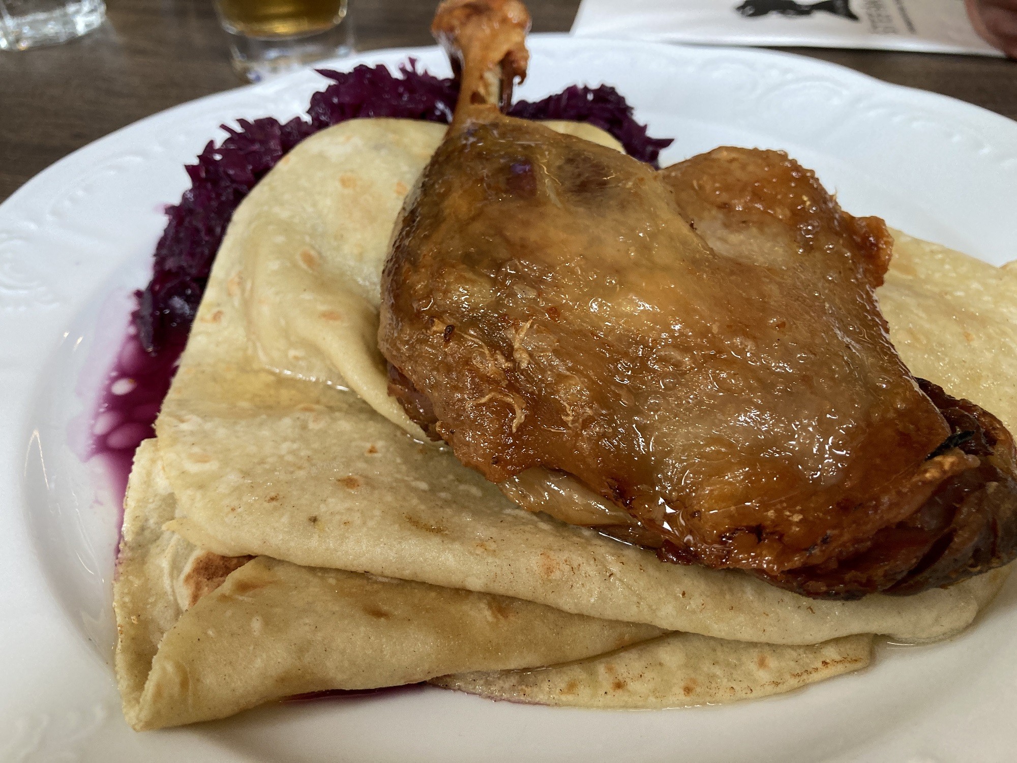 Vynikajúce bolo tiež Pečené kačacie stehno (13,99 €), ktoré nám naservírovali s dusenou červenou kapustou a domácimi zemiakovými lokšami. Aj v tomto prípade bolo mäso ideálne prepečené, ľahko sa oddeľovalo od kosti i krájalo, a koža chrumkavá ako treba. Kapusta bola chuťou, farbou aj konzistenciou bezchybná a nezaostávali ani lokše.