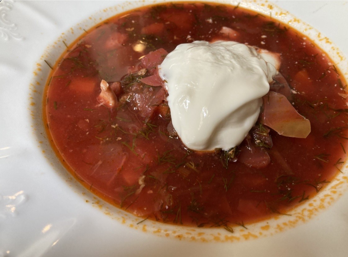 Ochutnali sme tiež tradičný ruský Boršč (5,99 €) s teľacím a hovädzím mäsom, kôprom, cviklou a štedrou dávkou kyslej smotany. Receptov na túto zdravú a sýtu polievku je množstvo, nám úplne vyhovela verzia Štefánky. Všetky chute sa v nej dobre pospájali a skvele do nich zapadol aj jemne pikantný kôpor, ktorým majstri kuchári nešetrili.