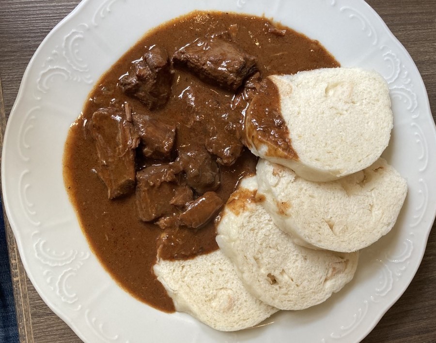 Z menu sme si pochutili na Jäger divinovom guláši (9,49 €) zo srnca a jeleňa, pripravenom na tymiáne a borievkach, máme radi tieto klasiky. Jedlo lákalo už na pohľad, vizuálne i vôňou, a potom prišiel chuťový pôžitok. Mäsko bolo šťavnaté a jemné, pripravené tak akurát, ešte chvíľu a rozpadne sa, to sa nám páči. Omáčka perfektná, všetko v nej bolo pridané s rozvahou, parená knedľa bola tiež fajn a veľkosť porcie viac ako dostatočná, i keď sa nám to na začiatku tak nezdalo.