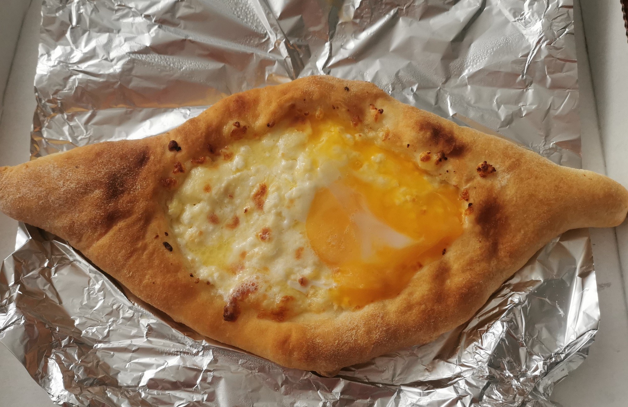 Ďalší náš výber mal názov Adžaruli Chačapuri (11,90 €). Je to slaný koláč z chlebového cesta s chrumkavou kôrkou, plnený vynikajúcim gruzínskym syrom a surovým vajíčkom navrchu. Syr musí byť horúci, aby sa vajíčko trochu uvarilo, keď si ho v ňom rozmiešate - to je však pri donáške trochu problém. Ale chuťovo bol koláč perfektný a porcia akurát pre statného chlapa.