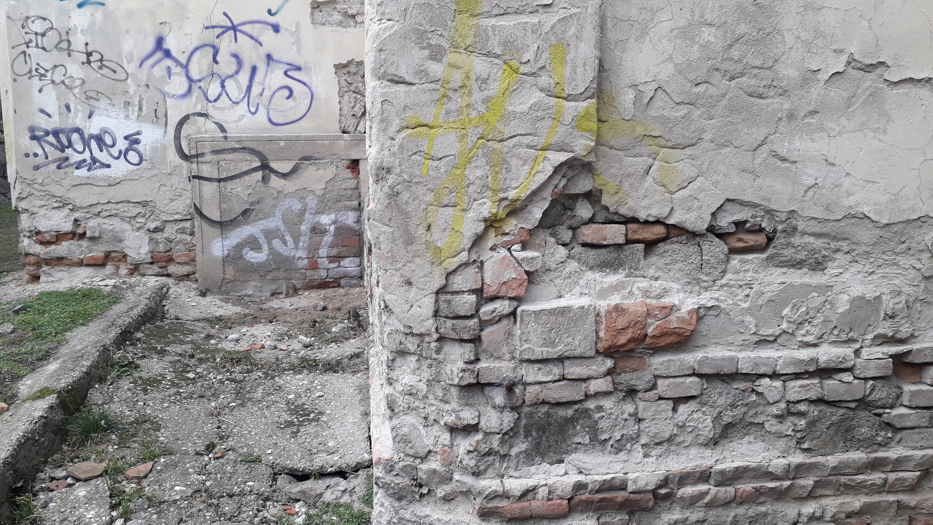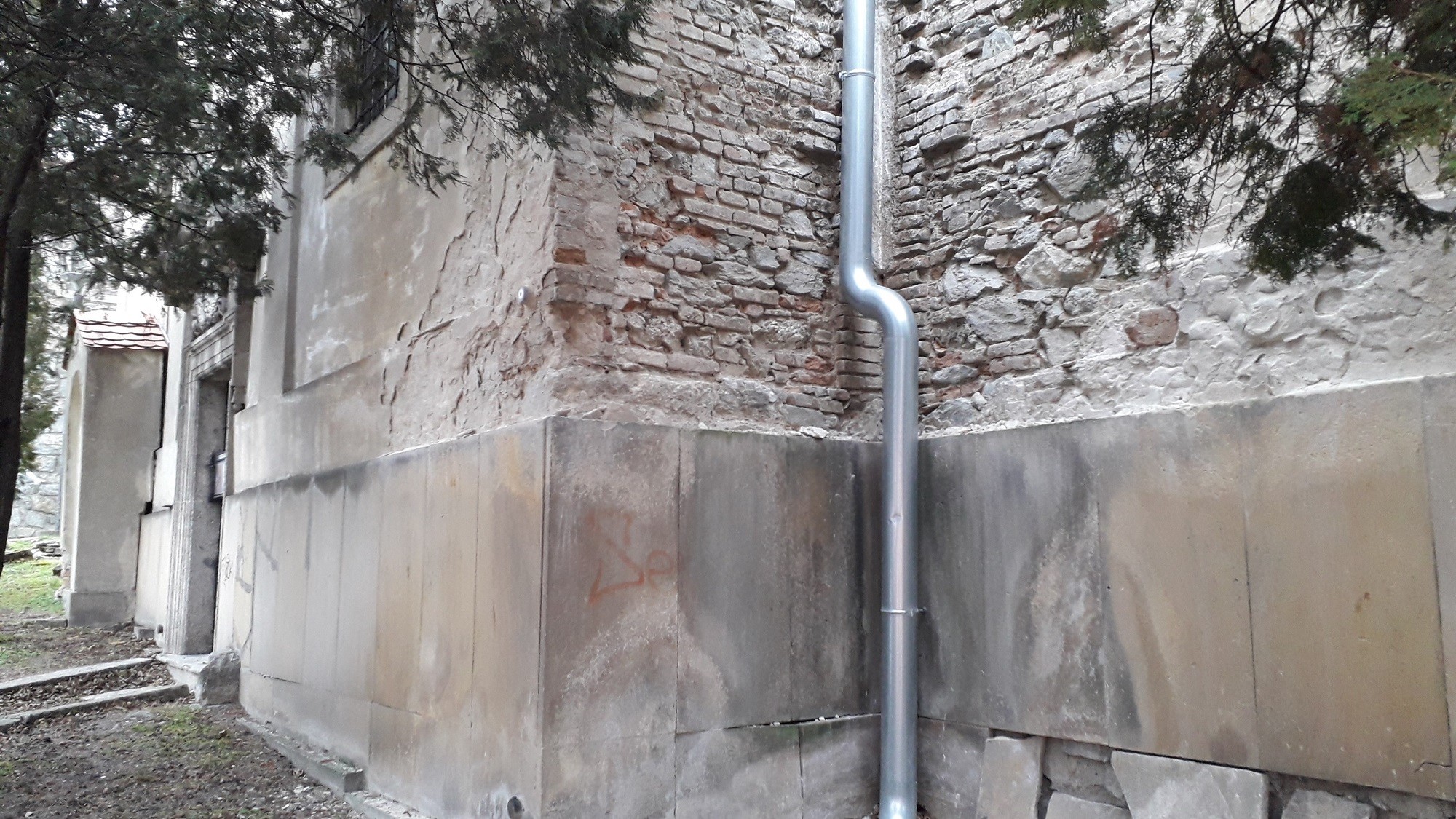 Nová odkvapová rúra je v ostrom kontraste so schátranou fasádou.