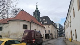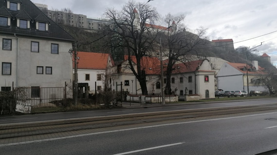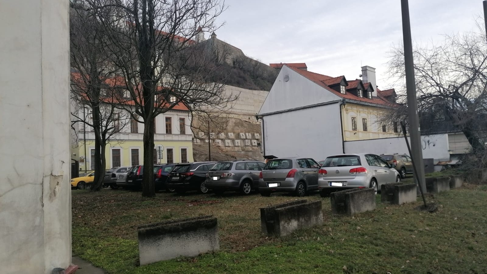 Na mieste budovy, ktorá stála napravo od kostola, dnes parkujú autá.