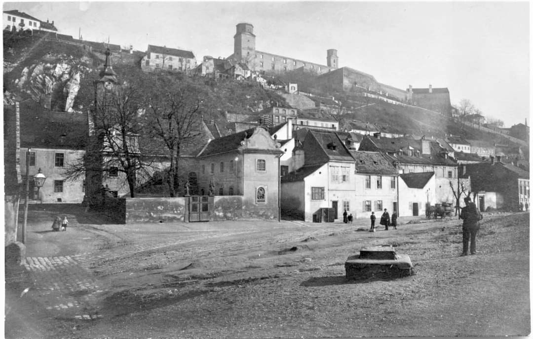 Podhradie v roku 1910. V ľavej polovici fotografie vidíme kostol, na mieste budovy napravo od neho v súčasnosti parkujú autá.