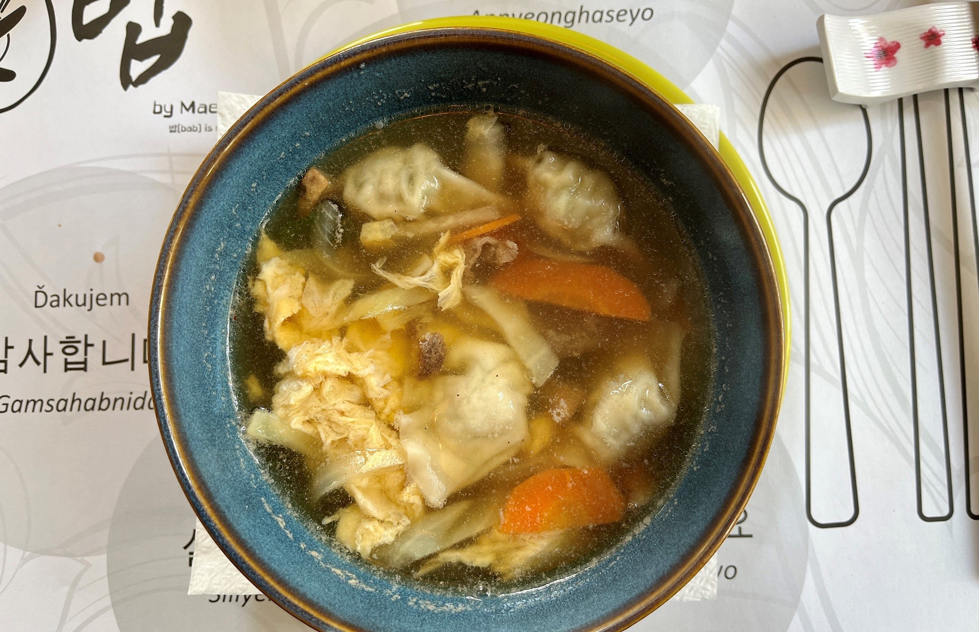 Začali sme zeleninovou polievkou Mandu Guk (3,50 €) s tenkými plátkami hovädzieho mäsa, množstvom rôznej zeleniny, a najmä výbornými pirôžkami mandu, plnenými mletým bravčovým mäsom a zeleninou. Náplň lahodná a cesto na rozdiel od gruzínskych chinkali jemné. Hovädzí vývar bol trošku pikantný, ale nie až tak, že by spálil chuťové poháriky. Celé to bolo vyvážené a veľmi dobré.