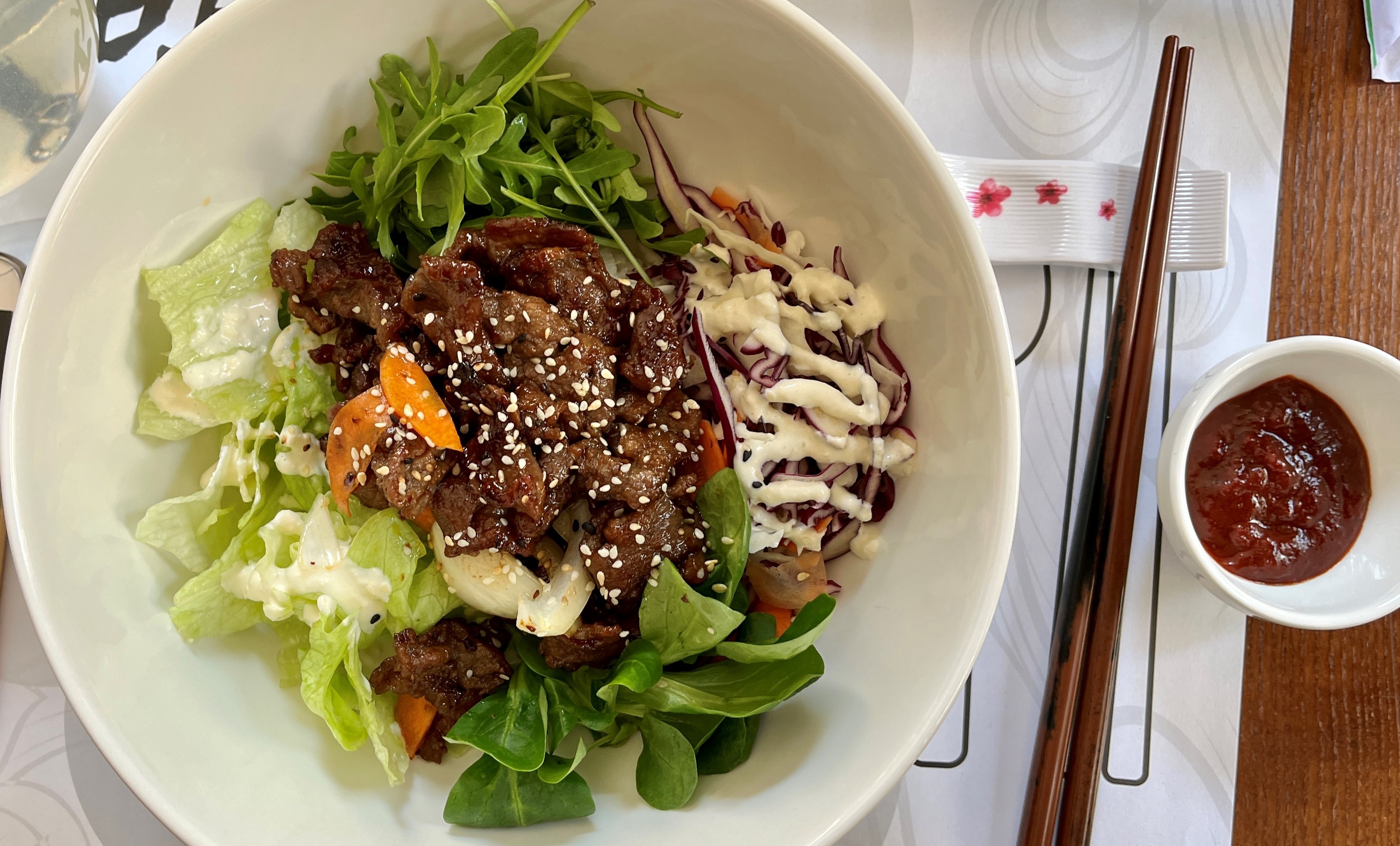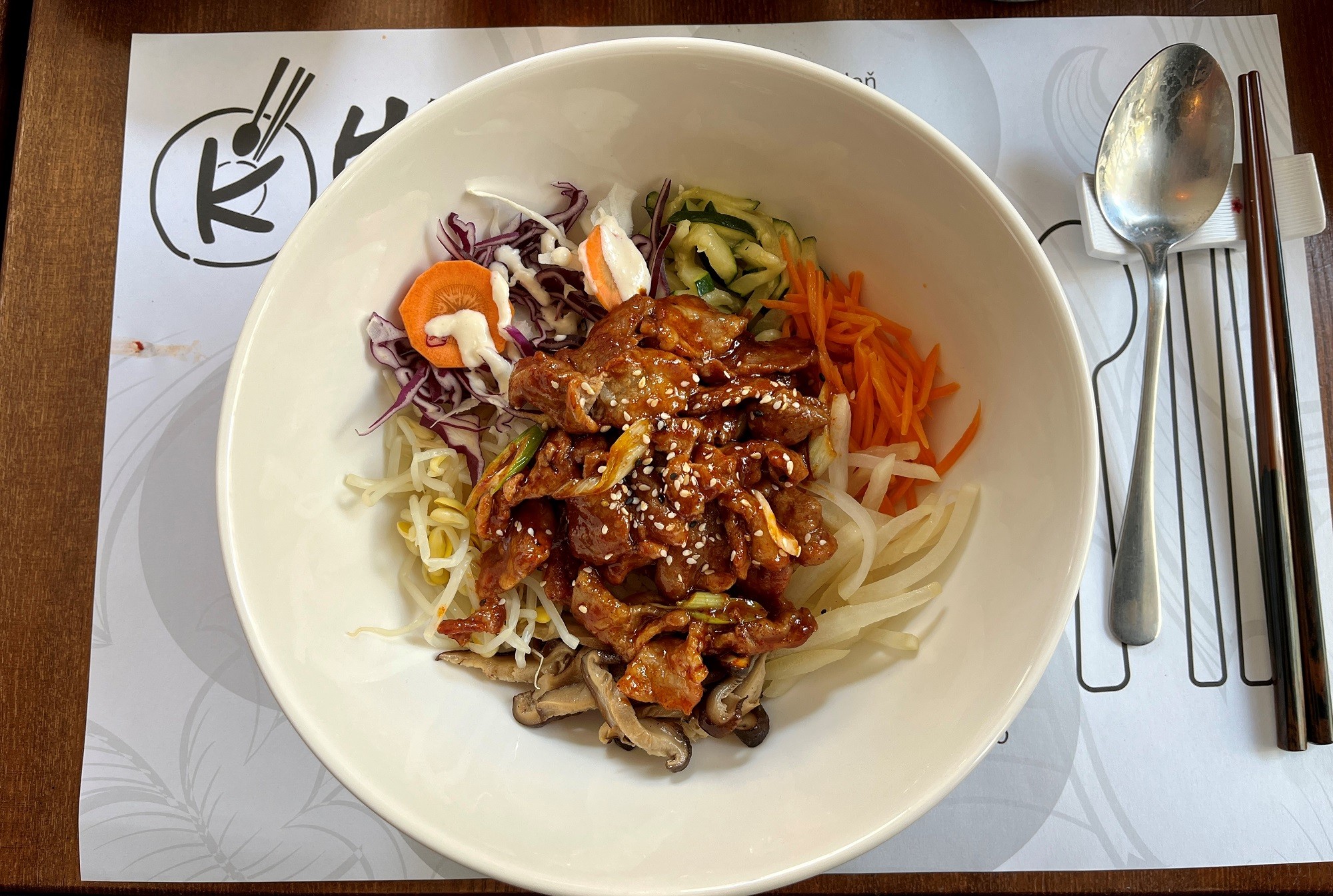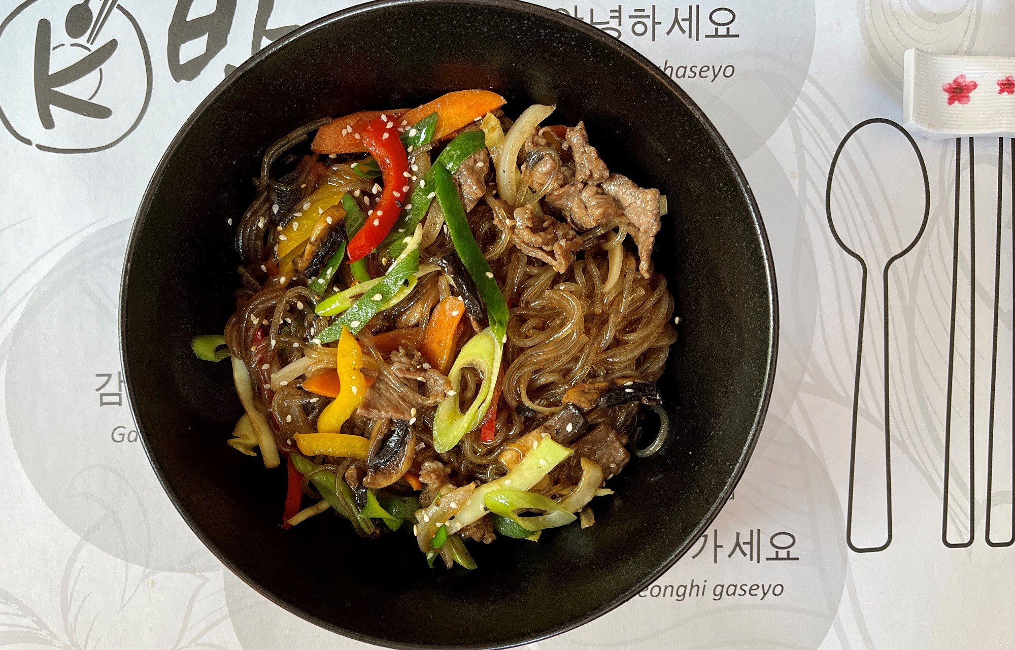 Pochutili sme si aj na Japchae (8,90 €), ktorého základom sú sklenené rezance zo sladkých zemiakov batatov, restované so zeleninou (mrkva, huby, kapusta, pór...) a hovädzím marinovaným mäsom bulgogi. Dobrá kombinácia ingrediencií, kde nás potešilo, že ani jedna chuťovo nevyčnievala. Nič príliš ostré, naopak, ladilo to spolu a bolo to lahodné.