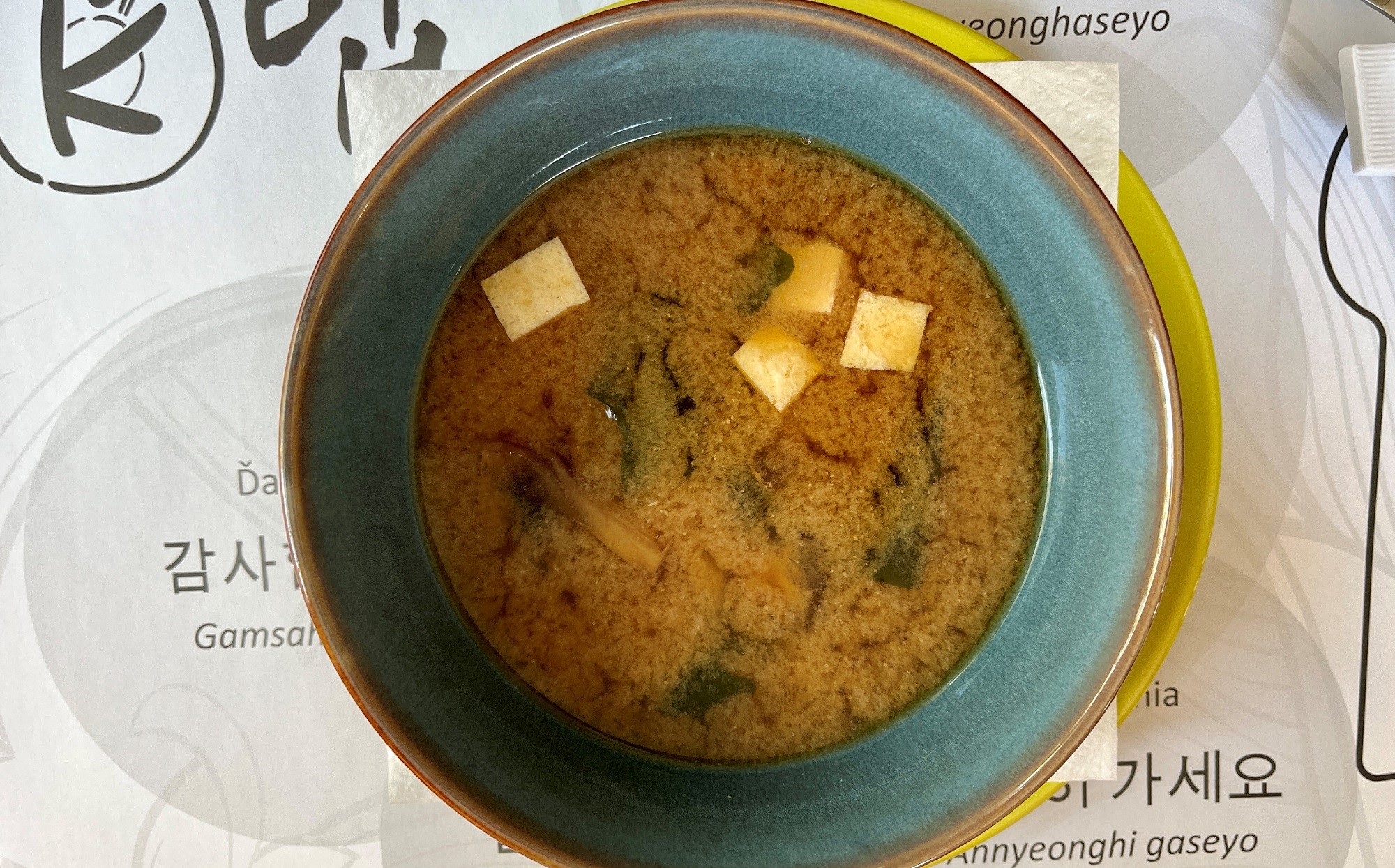 Ochutnali sme aj polievku z miso pasty, fermentovaných sójových bôbov, ktorá môže byť v rôznych variáciách, no platí, že je jednou z najzdravších. Tej našej, s názvom Misoshiru (1,90 €), dodali zaujímavý šmrnc morské riasy. Ocenili sme v nej aj pridané tofu a čerstvú, prekvapujúco chrumkavú zeleninu. Chuť jemná, konzistencia redšia, ale ako príprava na ďalší chod ideálna.