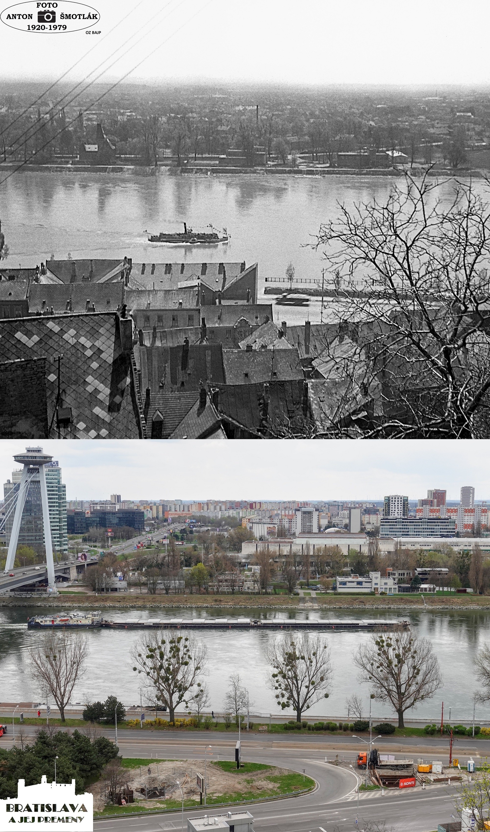 A takto sa zmenil pohľad z Bratislavského hradu: 4. máj 1956 a 7. apríl 2021.