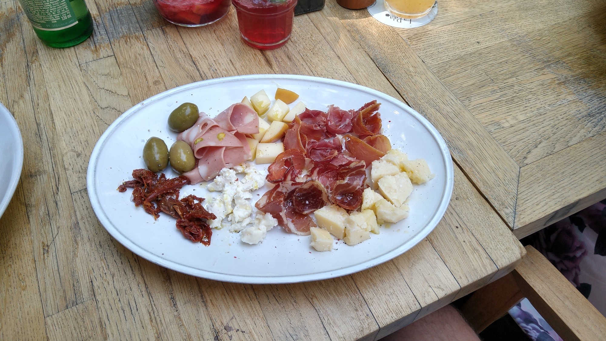 Začali sme typickým predjedlom Antipasti misti (13,50 €), pečivo k nemu (košík za 1,50 €) sme si však museli doobjednať, nepriniesli nám ho automaticky. Preslávená šunka prosciutto crudo bola výborná, takisto olivy aj sušené paradajky, zo syrov sme si najviac užili kozí a ovčí s ušľachtilou plesňou. Prijali by sme aj viac týchto kúskov, na úkor menej výrazných syrov scamorza a grana padano. Veľkosť porcie však úplne postačovala.