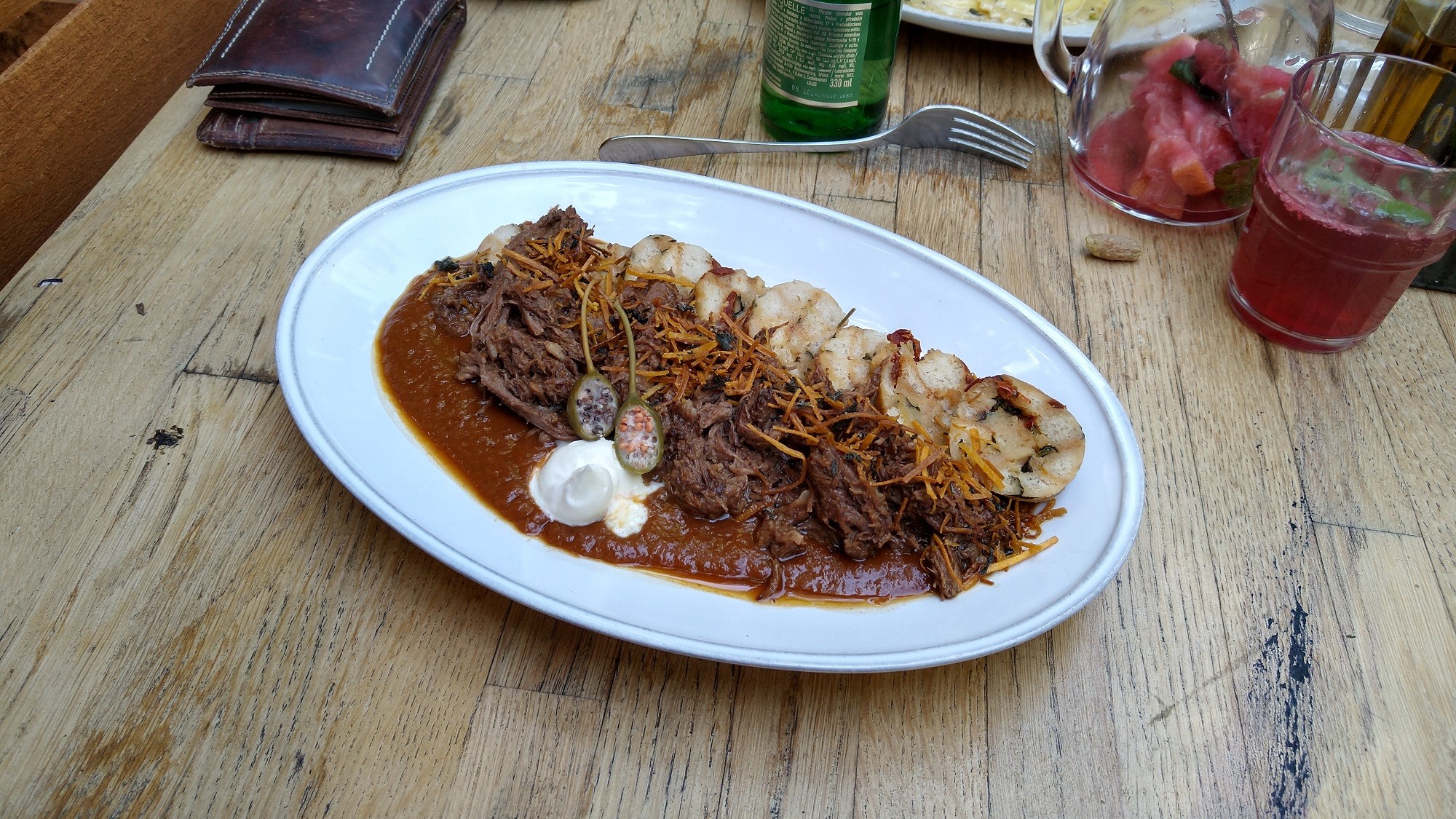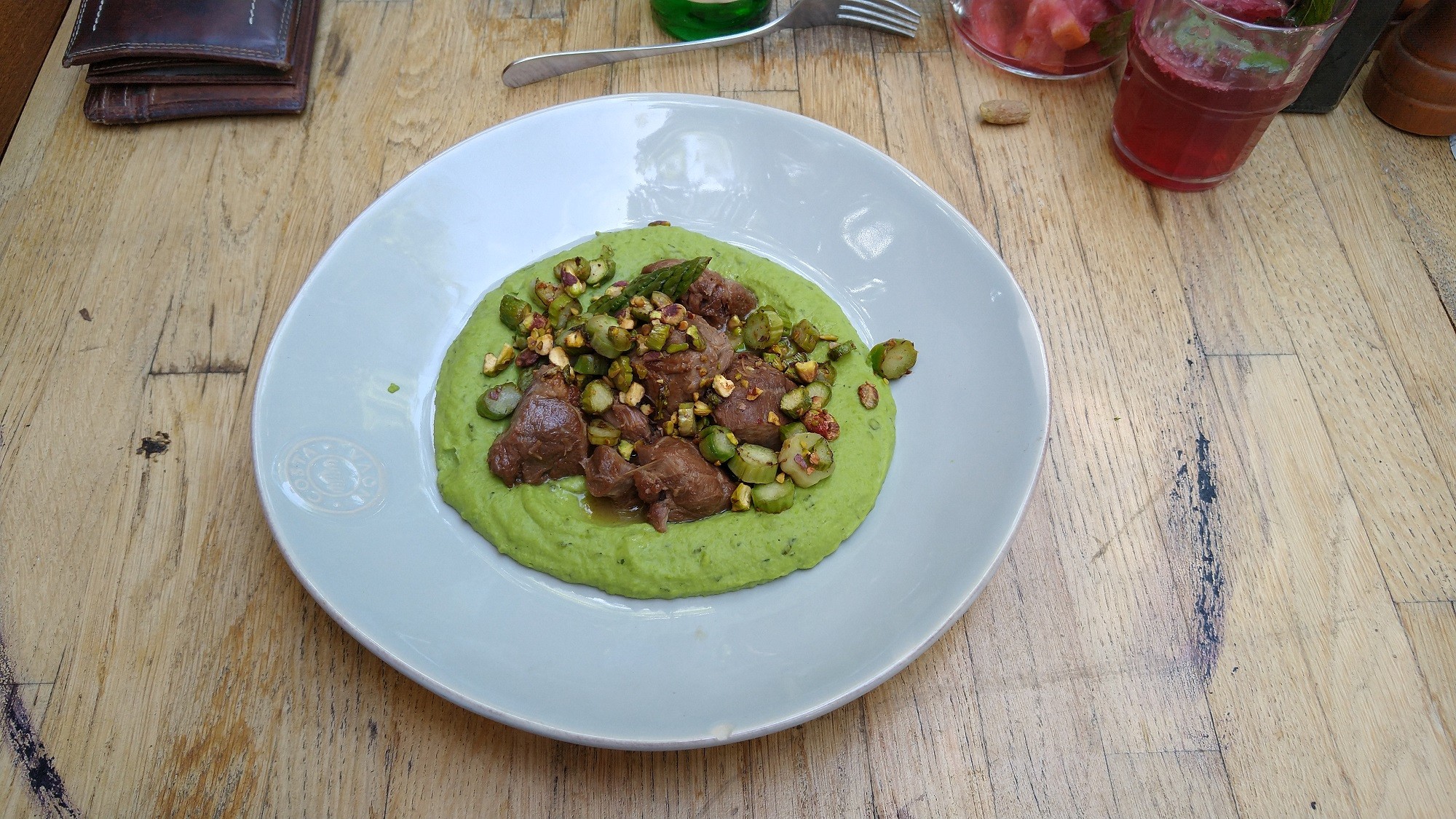 Ak ste na miernejšie chute, vyskúšajte Bravčové líčka (14,90 €) s hráškovým pyré s mätou a špargľovo-pistáciovou granolou s limetou. Mäsko bolo vynikajúce, jemnučké, priam sa rozplývalo na jazyku, výborne nám pripravili aj hráškové pyré. Keď si naberiete z každej chuti troška, precítite i limetku, ktorá celý zážitok pekne uzatvára, je tou správnou bodkou.