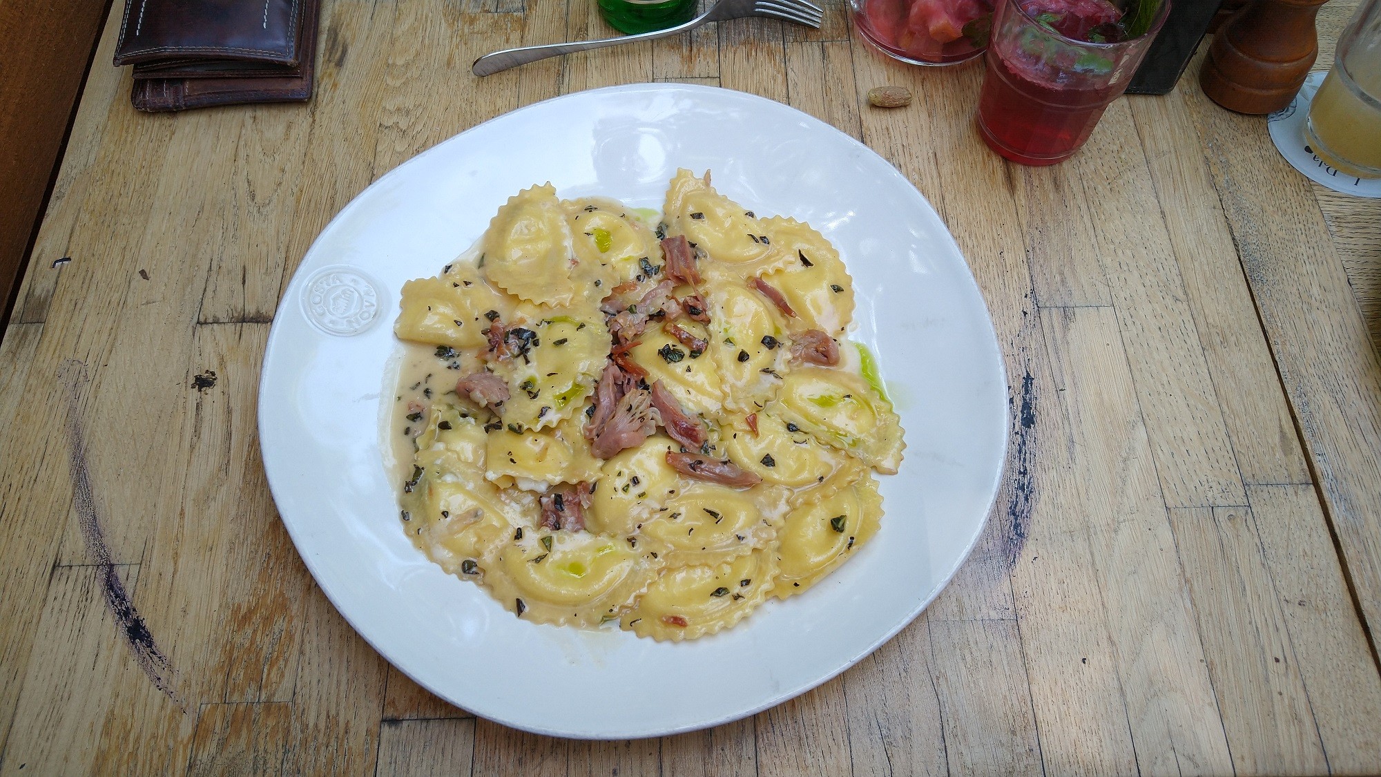 Vychutnali sme si však Ravioli quatro formaggi (12,60 €), taštičky plnené štyrmi druhmi syra, gorgonzolou, mozzarellou, grana padano a ricottou, na ktoré sme si navyše nasypali strúhaný parmezán (štedrú misku tohto syra sme mali k dispozícii spolu s fľašou olivového oleja). Cestoviny boli jemné, poctivé domáce, obohatili ich kúsky šunky prosciutto crudo a k dokonalosti priviedla vynikajúca vínovo-šalviová omáčka.