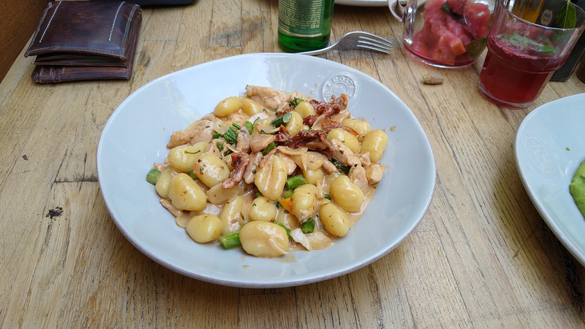 Odporúčame tiež špecialitu Gnocchi gorgonzola (12,20 €), ktorú pripravujú s kuracím mäsom a lahodnou gorgonzolovou omáčkou s mascarpone. Potešila aj pridanými sušenými paradajkami a baby brokolicou, celé to bolo výborné a jednoznačne z čerstvých surovín. Nič nám nechýbalo, no i v tomto prípade sme si prisypali za lyžičku parmezánu, bol by hriech ignorovať ho pri stole.