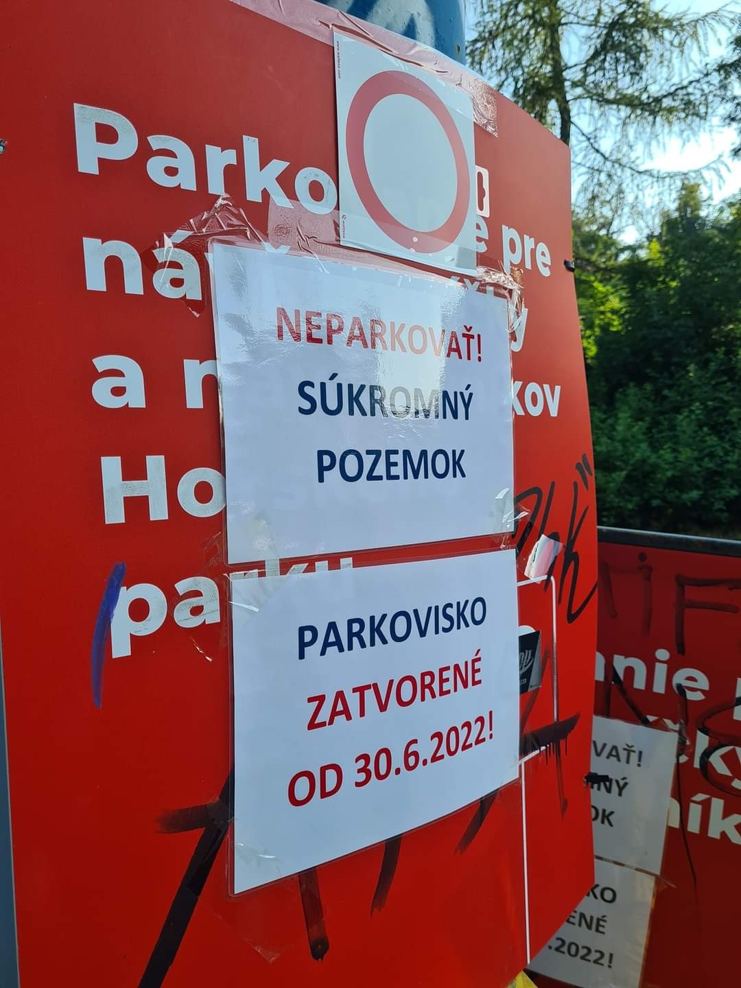 Na parkovisko sme sa boli pozrieť aj dnes, v piatok 1. júla, a svietil tam spomínaný nápis s výkričníkmi: Neparkovať! Súkromný pozemok. Parkovisko zatvorené od 30. 6. 2022! Oznamy sú umiestnené priamo na tabuli magistrátu, ktorá informuje, že parkovisko slúži pre "návštevníčky a návštevníkov Horského parku".