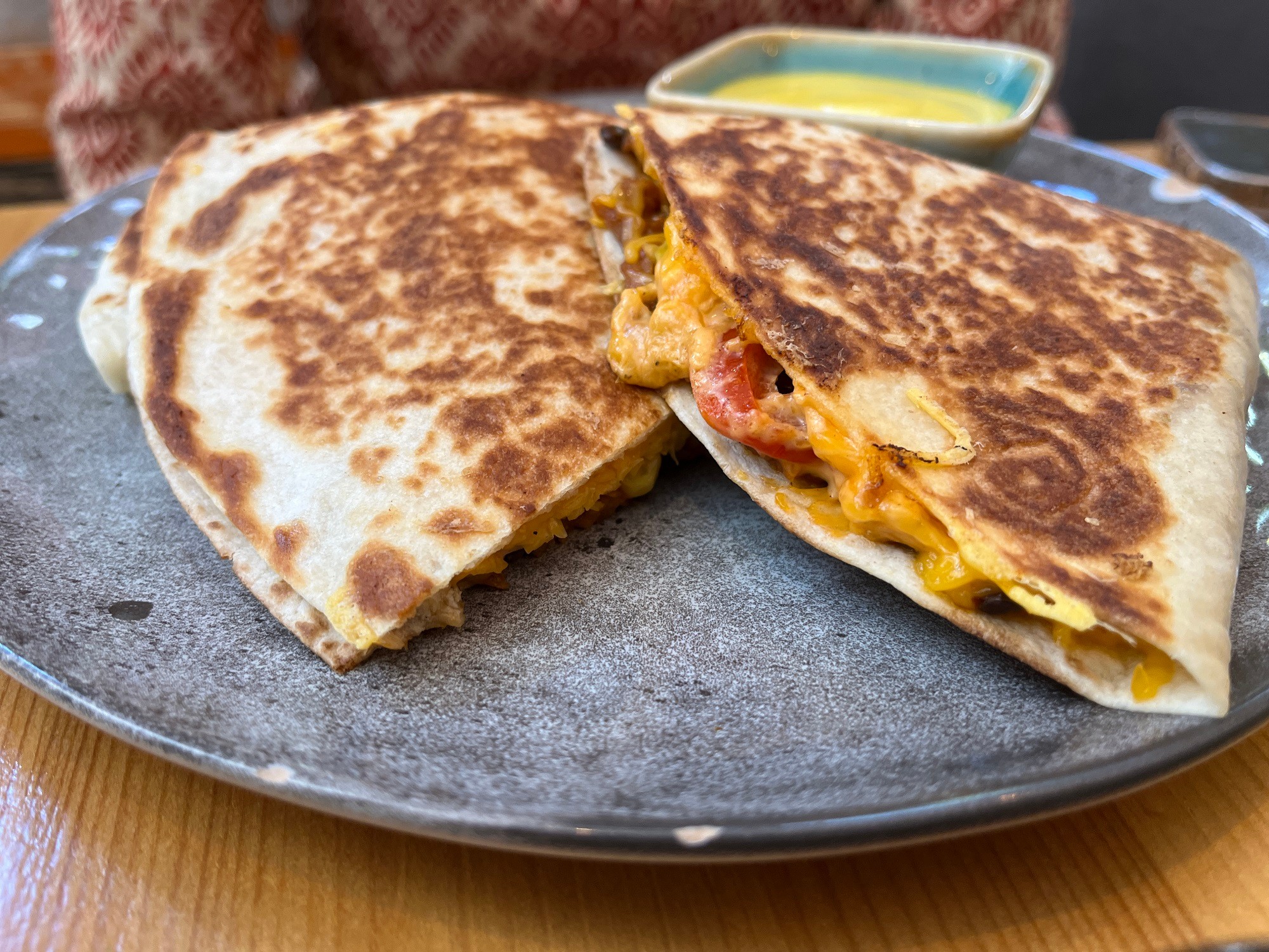 Druhou rýchlou pochúťkou bola El Mejor Quesadilla (7,50 €). Tortilla chrumkavá, v nej delikátne ochutené mleté vegemäso s čiernou šošovicou, kukuricou, grilovanou červenou paprikou, cibuľkou.... Opäť malý zážitok. Vyváženú mexickú chuť dotvoril vegsyr, ktorý sa vnútri placky pekne roztekal. Keďže sa nám nežiadalo pikantné, vynechali sme habanero dip, hoci k tejto špecialitke určite patrí. Tentoraz sme si však vystačili so skvelou nesyrovou omáčkou, ktorú tiež podávajú ku quesadille. Bola vláčna a krémová, celkový dojem vyzdvihla o ďalší stupienok vyššie. Mimochodom, „el mejor“ znamená „najlepší“ a konštatujeme, že tento prívlastok si quesadilla zaslúžila.