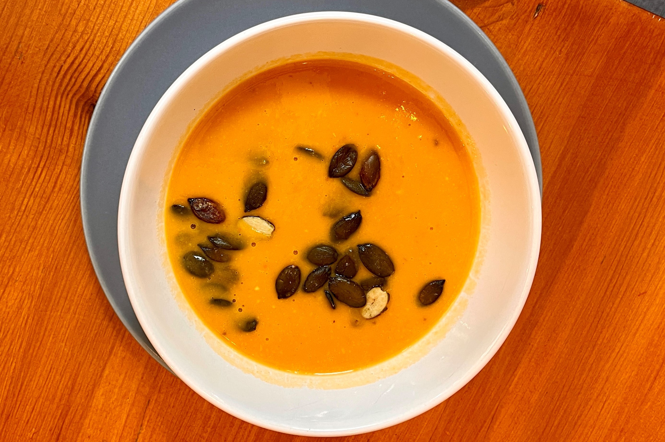 V rámci menu (7,50 €) podávali v deň našej návštevy polievku Hokkaidovo-batatový krém, a bol to naozaj viac krém ako polievka – hutný a chutný, voňavý a lákavo farebný, vyzdobený tekvicovými semiačkami. Dobrota, ktorá zachutí aj vašim deťom, a porcia taká, že slabším jedákom vie nahradiť obed.