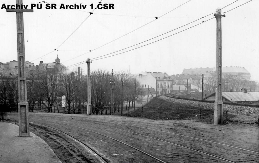 Na fotografii z roku 1923 môžeme vidieť trať "Viedenskej električky" sprevádzkovanej v roku 1914. Merala 69 kilometrov a viedla z dnešného Námestia Ľudovíta Štúra na Starý most (Most Františka Jozefa) cez Sad Janka Kráľa (AuPark), Petržalku (Engerau) a Kopčany na Berg a Viedeň. Vpravo vidno železničný násyp a spomínané vlakové koľaje, ktoré zostali na moste i roky po tom, keď už vlak po tejto trati nepremával.