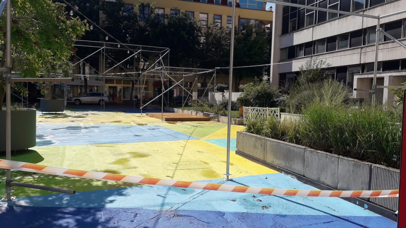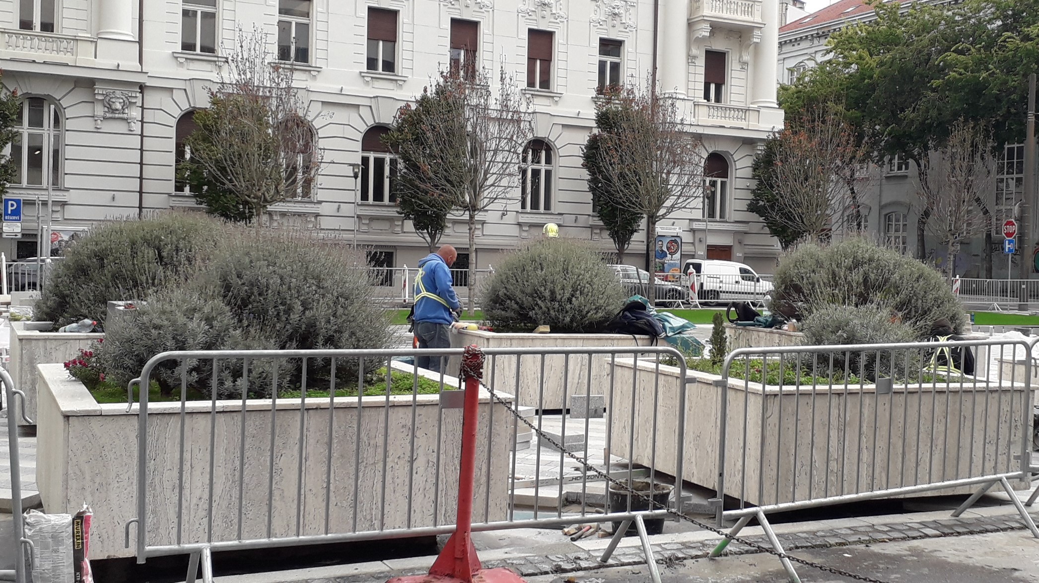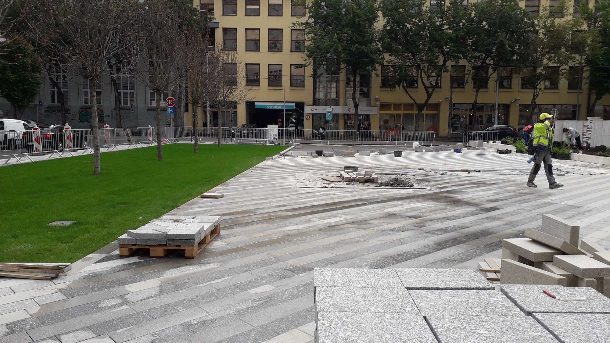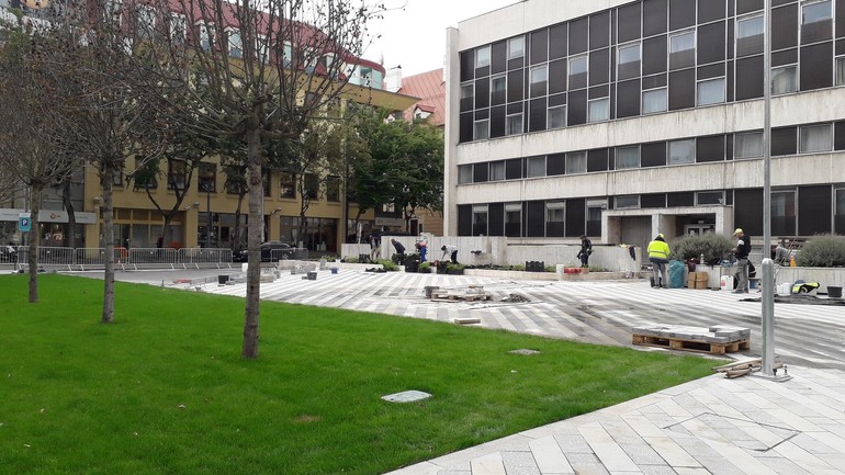 V lete však už na ploche bývalého parkoviska, ktoré fungovalo do polovice roku 2019, pribudli prvé stromy a asfaltový povrch, premaľovaný žltou, modrou či tyrkysovou farbou, bol odstránený (umelecká kresba vznikla v rámci dočasnej úpravy námestia). A keď sme sa sem prišli pozrieť koncom tohto týždňa, videli sme trávnik pod stromami, takmer na celej ploche položenú novú dlažbu a zeleň vo veľkých kamenných kvetináčoch pôsobila upravene. Mobilné kvetináče pridané v rámci dočasného zlepšenia priestoru sú dávno preč.