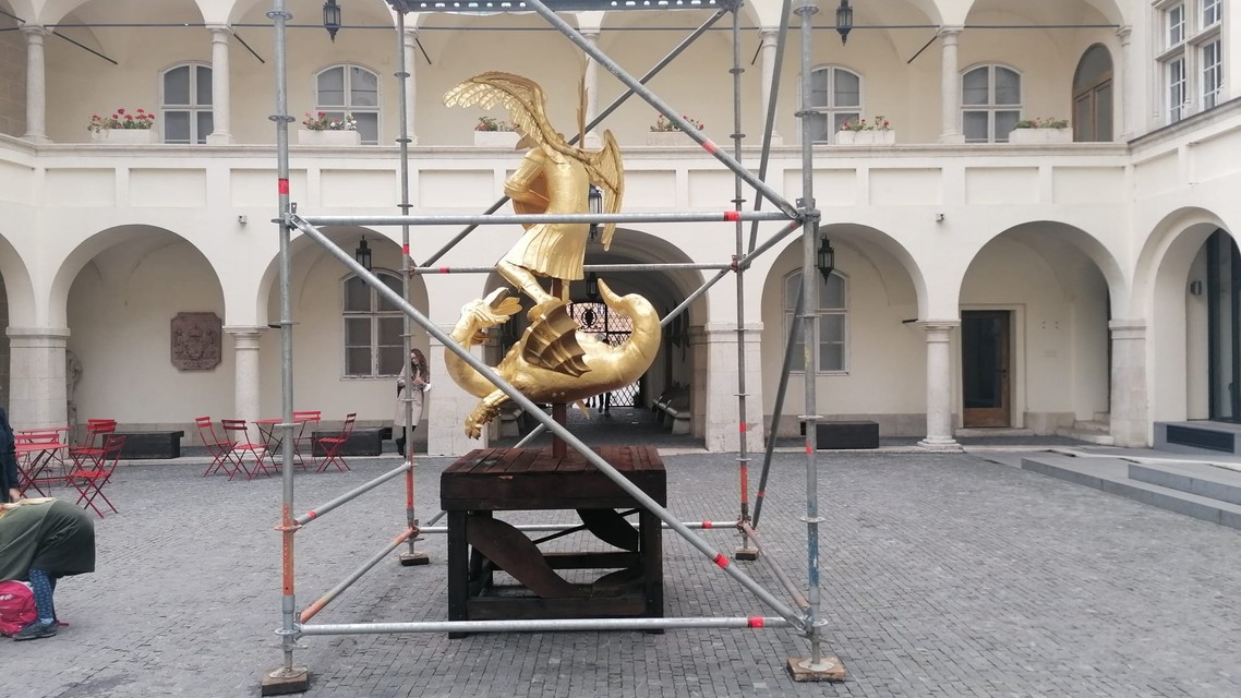 Proces zlátenia súsošia mala verejnosť možnosť vidieť priamo na nádvorí Apponyiho paláca v priestoroch Múzea mesta Bratislavy (MMB). "Celé súsošie archanjela Michala s drakom bolo pozlátené 23,5-karátovým plátkovým zlatom, ktorého sa spotrebovalo 28 gramov. Trvácnosť takéhoto zlátenia je odhadom niekoľko desaťročí, všetko však závisí od miery mechanického opotrebovávania, ktorému bude socha v exteriéri vystavená," vysvetľuje Michal Augustovič, kurátor historických a umeleckohistorických zbierok MMB a koordinátor procesu obnovy Michalskej veže. Súsošie archanjela Michala bojujúceho s drakom vytvoril v 18. storočí medikováčsky majster Peter Eller.
