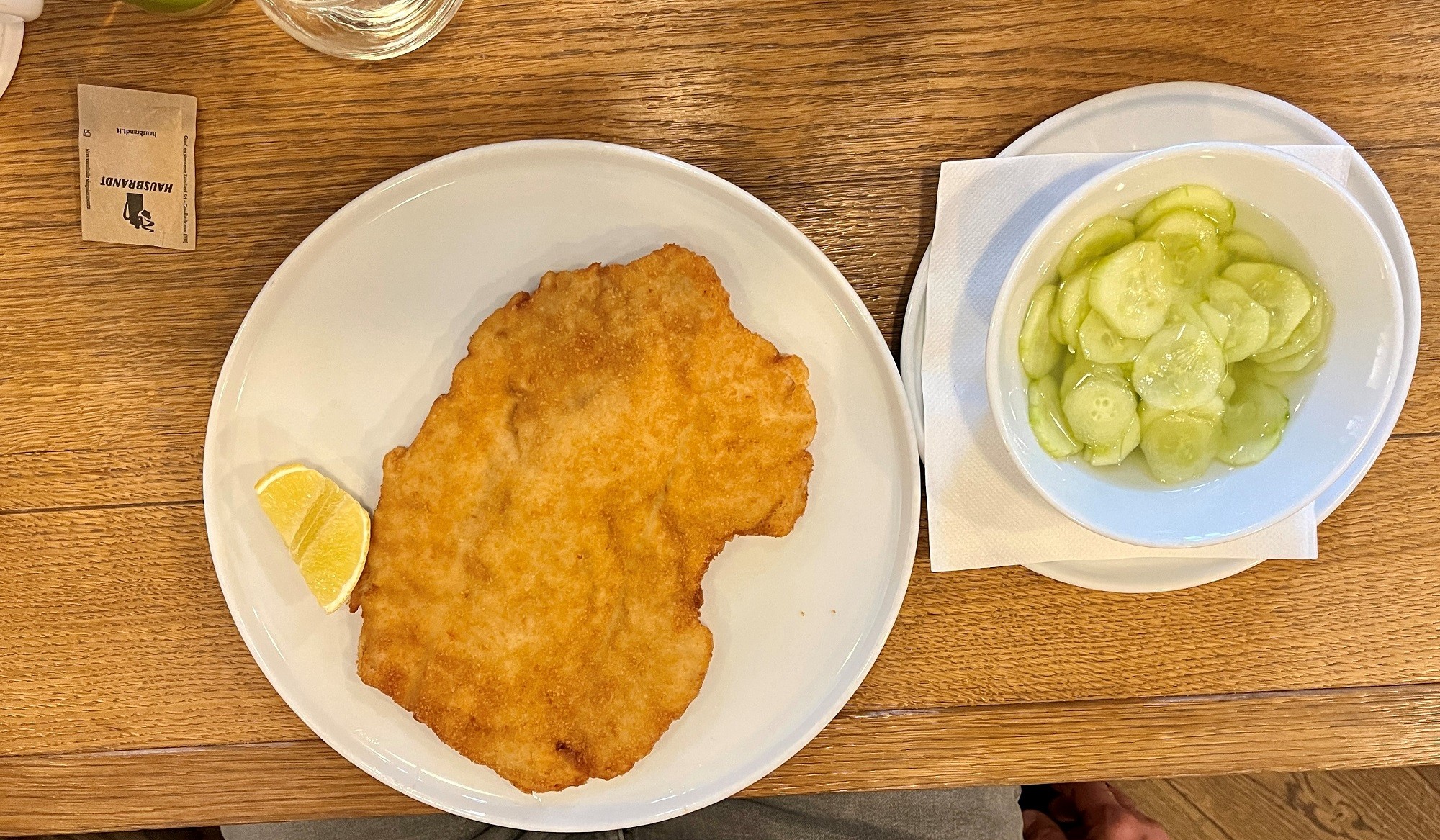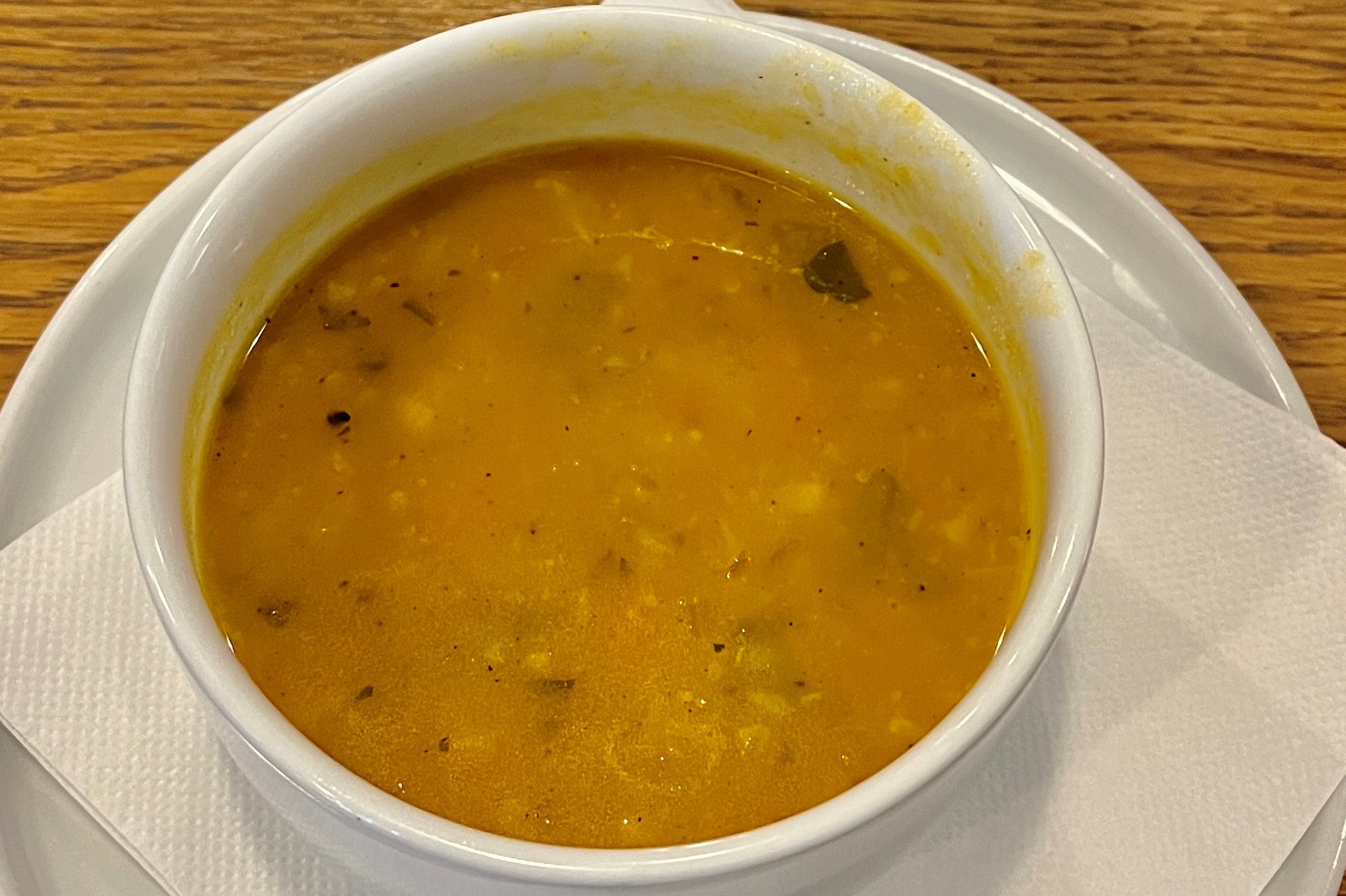 Návštevníkov býva v čase obeda veľa, ale stále sme si vedeli nájsť dobrý stôl. Horšie to bolo s čakaním na jedlo, zeleninovú polievku (1,49 €) sme síce mali na stole raz-dva, ale hlavné jedlá až o ďalších takmer štyridsať minút. Zdržanie vraj spôsobilo pečenie kuriatka, ktoré sme si objednali. Polievku hodnotíme ako dobrú klasiku, nesklamala, ale ani neohúrila ničím mimoriadnym, dávame jej priemernú známku.