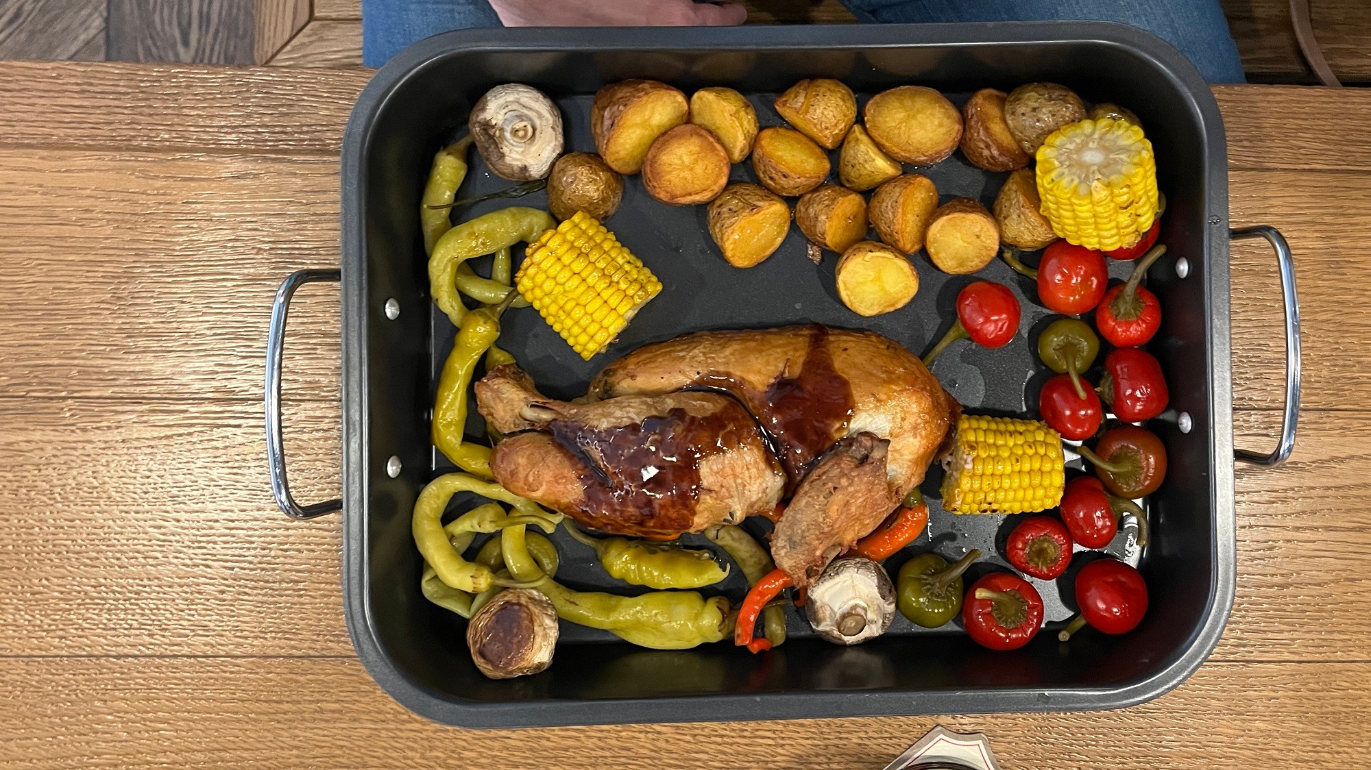 Pečené kuriatko (14,50 €), ktoré tak skúšalo našu trpezlivosť, je určite dobrá voľba v prípade, že ste veľmi, veľmi hladní. Z tejto porcie - oficiálne 500 g, podľa nášho odhadu aj viac - sa naje úplne každý, dokonca postačí i dvojici. Na pekáč sme totiž dostali celú polovicu pečeného marinového kuraťa. Chuťovo bolo mäsko fajn, ale na náš vkus až príliš mäkké, ak ho máte radi upečené dochrumkava, môže vás mierne sklamať. Obloženiu nebolo čo vyčítať, ocenia ho najmä priaznivci mierne pikantných pokrmov. Opekané baby zemiaky boli chutné, grilovaná kukurica sladučká, potešili aj alma papričky a baranie rohy, tých bolo v pekáči až-až.