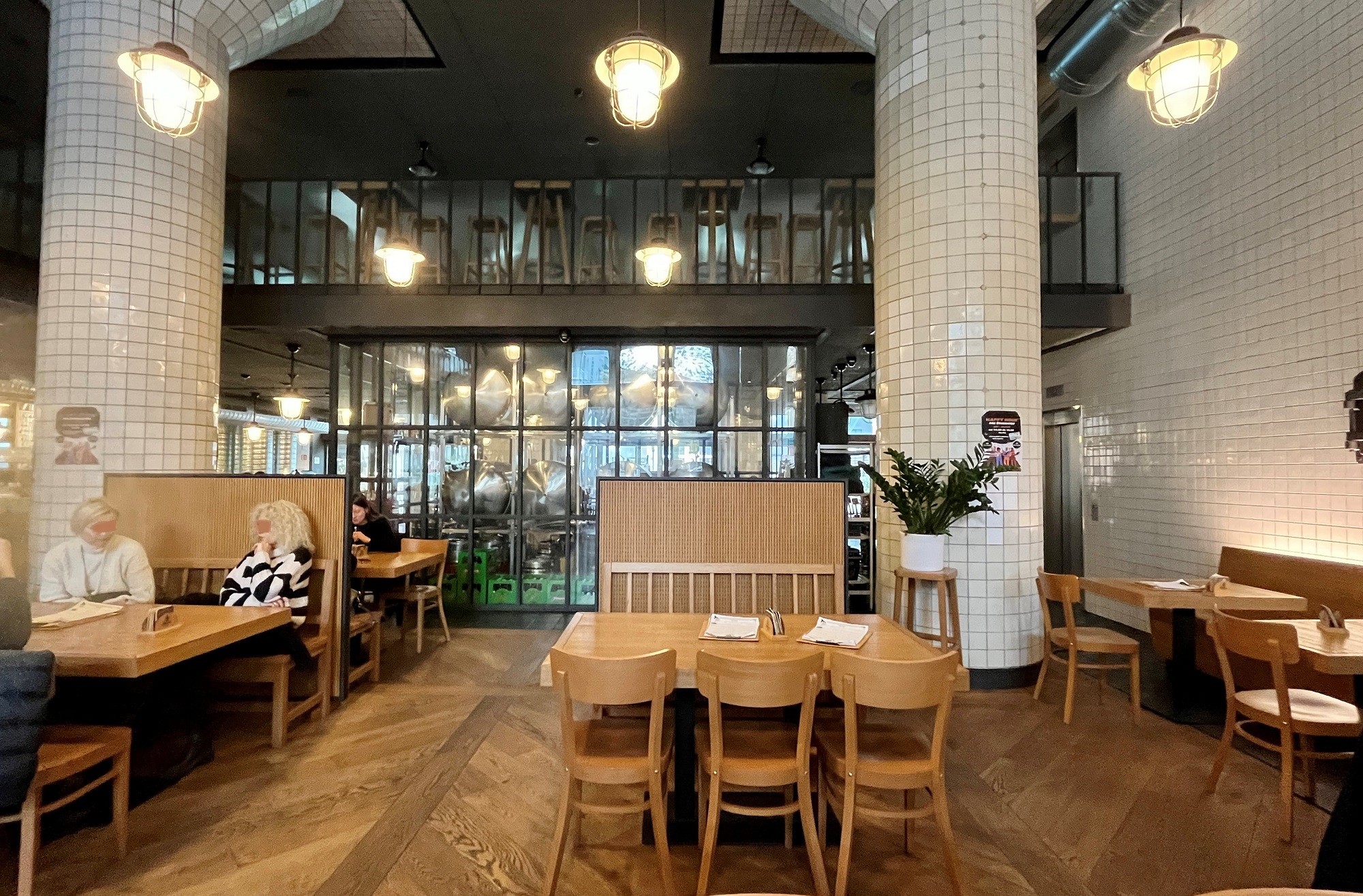 Interiér reštaurácie. Pri obnove sa zachovali pôvodné stĺpy aj lampy.