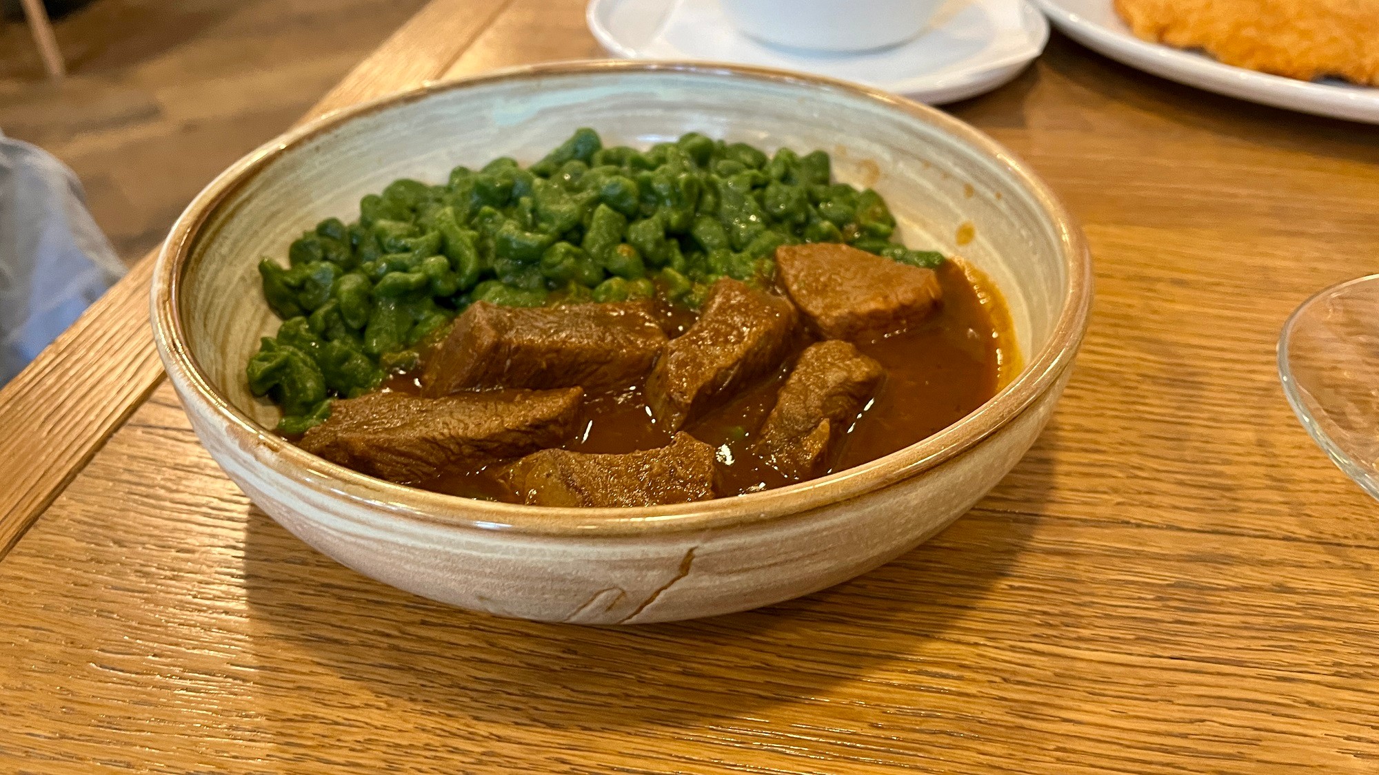 Napokon sme otestovali Teľací perkelt (12,90 €) s domácimi špenátovými haluškami. K mäsku sme nemali nijaké výhrady, naopak, bolo veľmi chutné a jemné. Maslové halušky, ktoré sme s pasiou obracali v skvelej v omáčke, sa nám žiadalo trošku dosoliť, ale to už je náš zlozvyk. Inak žiadna výčitka.