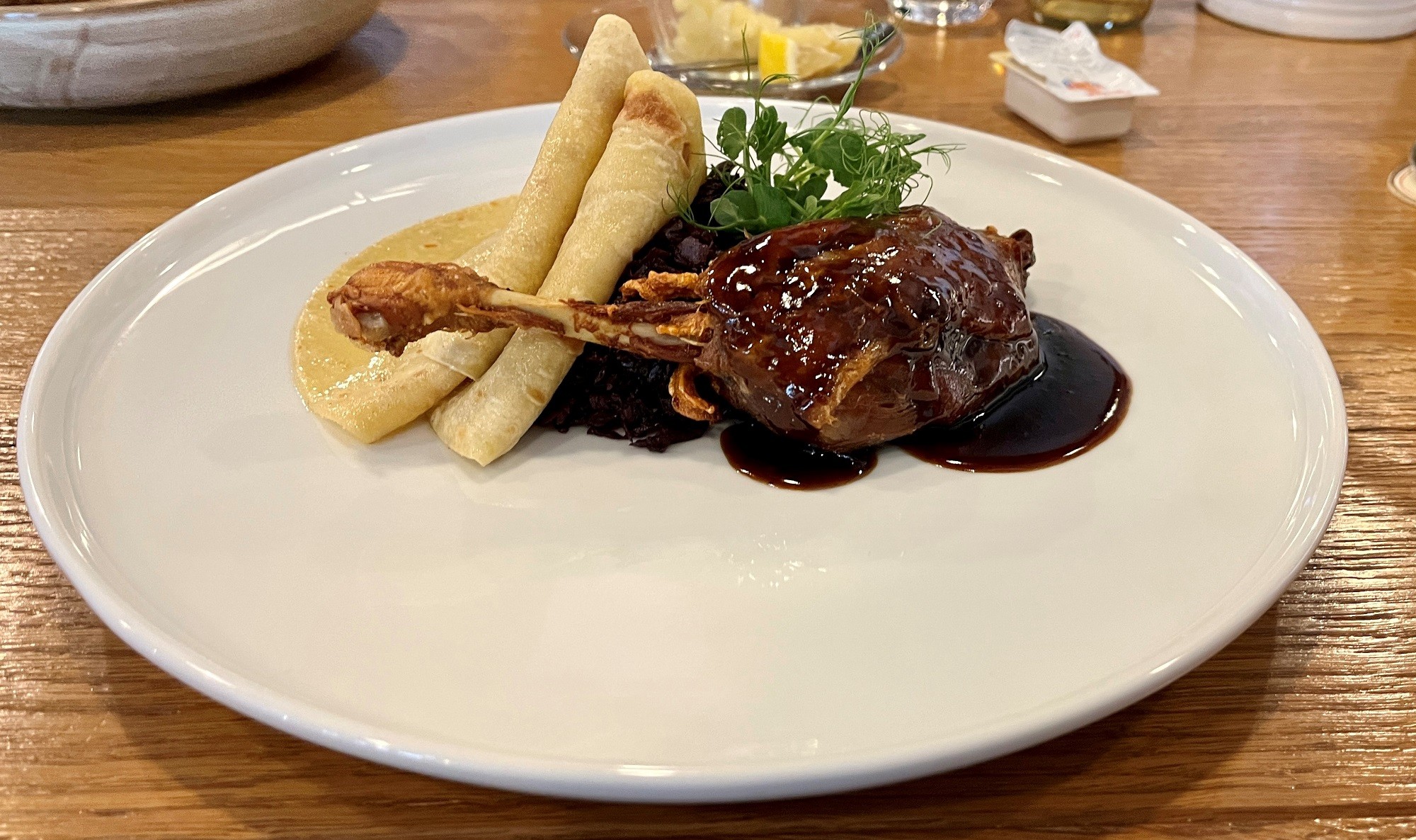 Ochutnali sme tiež konfitované Kačacie stehno (14,50 €), ktoré zas bolo na rozdiel od pečeného kurčaťa malé, pokojne by sme zvládli aj dva kúsky. Mäso bolo trochu suché, no lokše k nemu fajn. Chutila nám takisto dusená červená kapusta – neublíži ani tomu, kto ju má rád kyslejšiu, ani tomu, kto uprednostňuje sladšiu verziu.