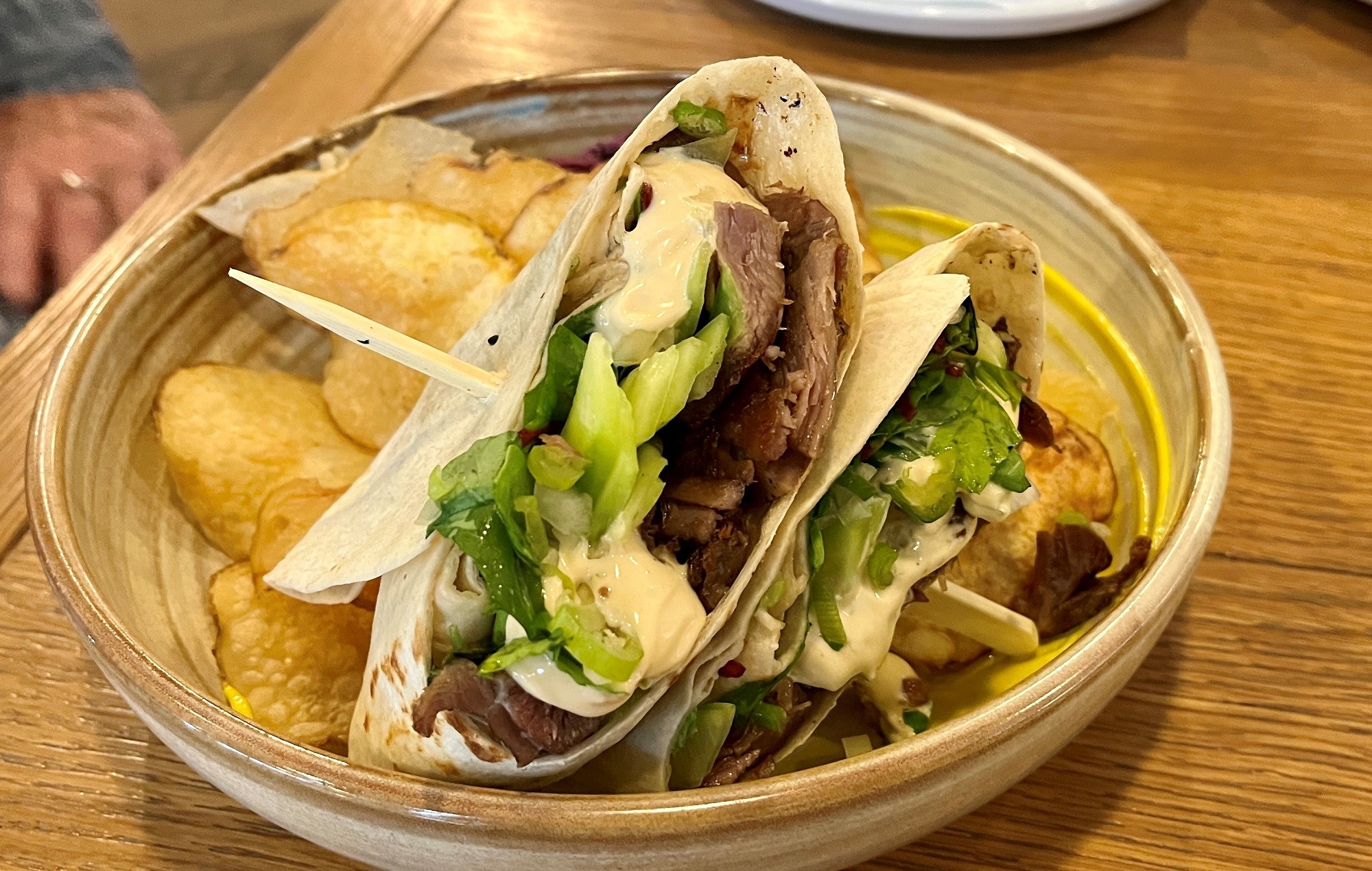 Ďalšou voľbou bol Wrap s kačacím mäsom (10,50 €), k tomu čipsy, tenučké domáce zemiakové lupienky. Tortilla naplnená trhaným mäsom a zeleninou neprekvapila ničím výnimočným. Šalát coleslaw však predsa len potešil, dresing tiež, a šmrnc tejto špecialite dodalo avokádo, ibaže kačacie bolo opäť suchšie.
