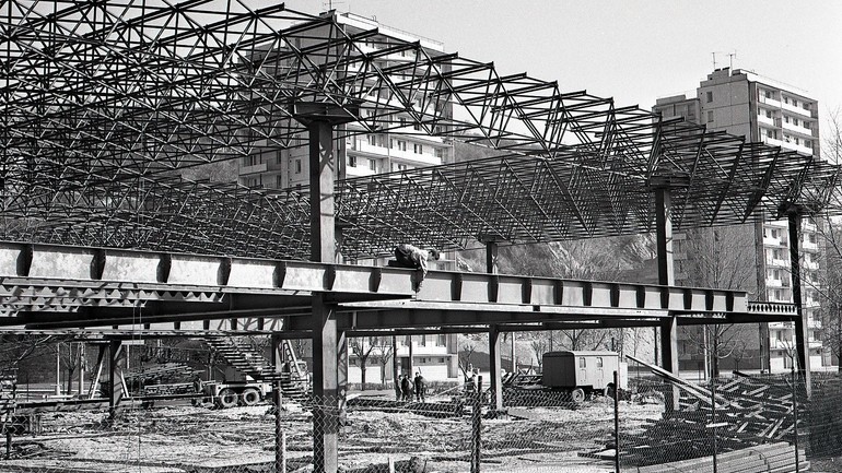 Na dobovej fotografii z roku 1968 vidíte oceľovú konštrukciu budovy, ktorá vyrastá oproti východu z tunela pod hradným vrchom. Spomínate si na ňu? Už dávno patrí minulosti, pozrite sa, ako toto miesto vyzerá dnes.