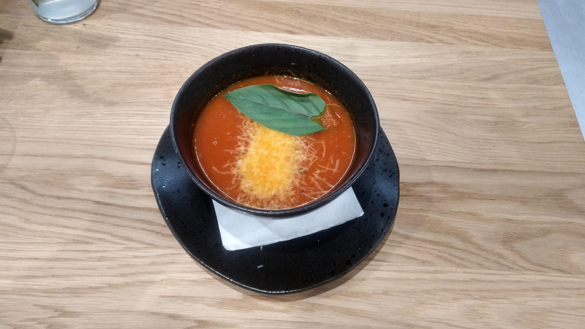 Paradajkovú polievku (4,50 €) so syrom, ozdobenú efektným listom bazalky, nám pripravili jednoznačne z kvalitných ingrediencií. Bola svieža, výborne dochutená a hustá tak akurát. Niekto by ju možno uprednostnil v sladšej verzii, ale našim chutiam vcelku vyhovela.
