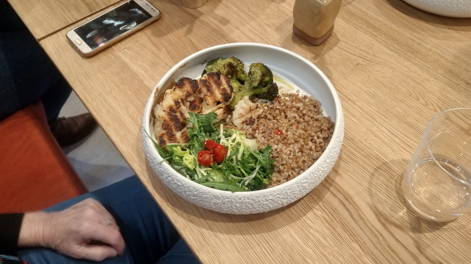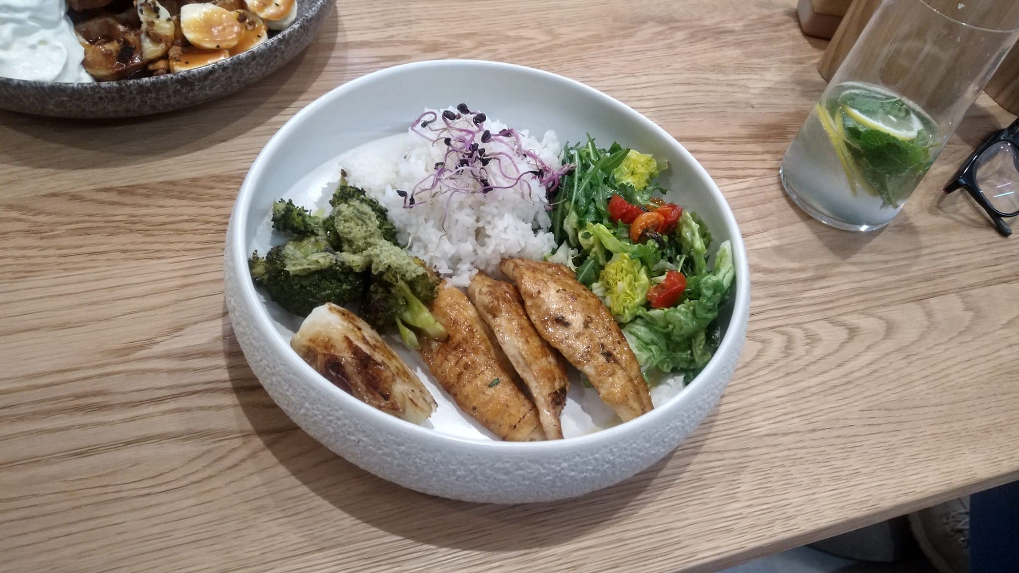 Bagle i wafle v najrôznejších verziách sa hodia viac na raňajky, zato na obed, čo je náš prípad, odporúča niektorú zo špecialít, ktoré servírujú v zohriatych miskách (lunch bowls). K tomu dresing podľa výberu, buď habanero alebo mayo. My volíme tretiu možnosť, olivový olej, a nie je to žiaden problém. V rámci obeda si môžeme pokojne dať aj večeru, no hoci viaceré názvy znejú lákavo (napríklad Dry Aged Hovädzia sviečková s chimichurri omáčkou), predsa len zostávame pri miskách.