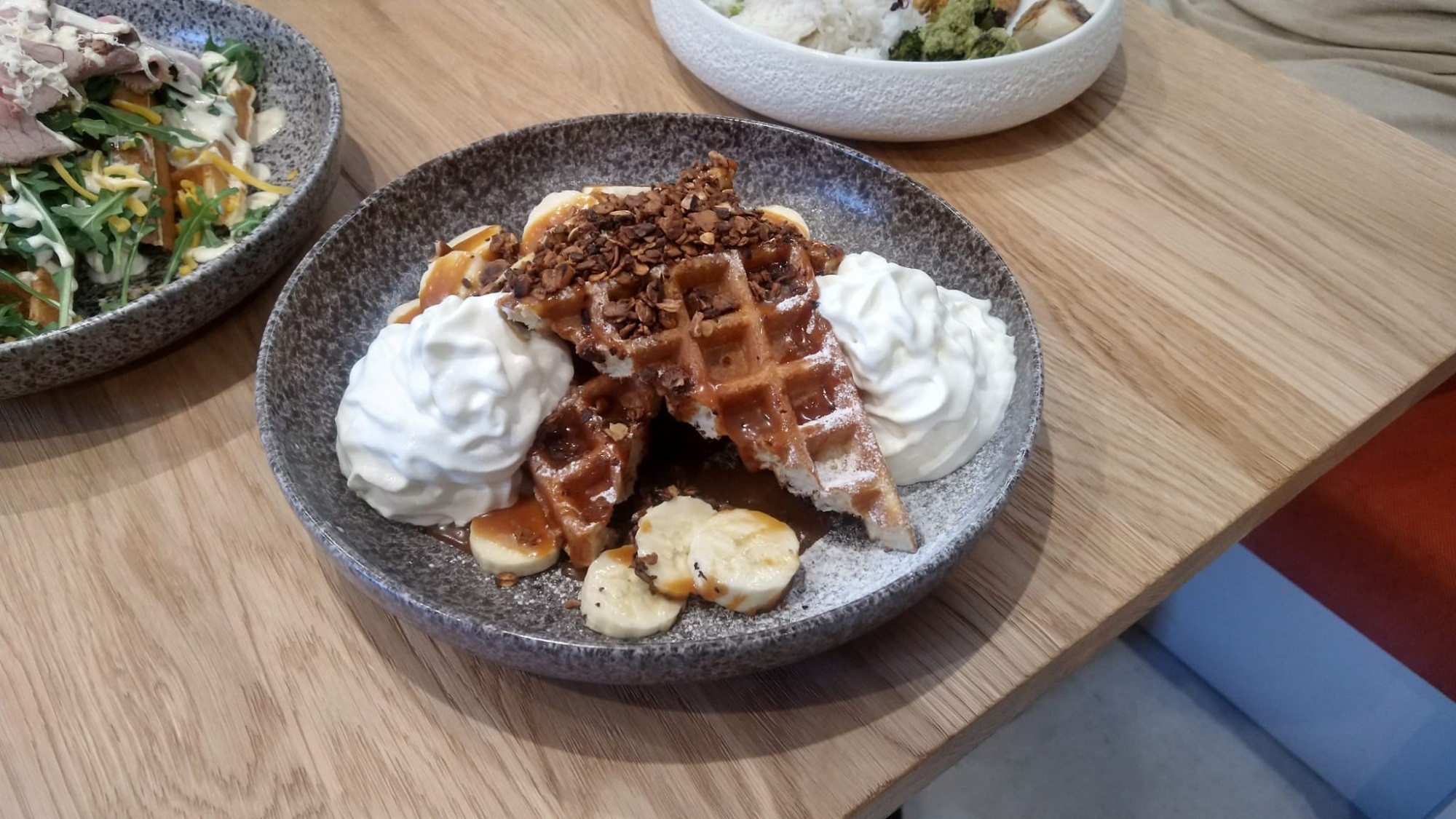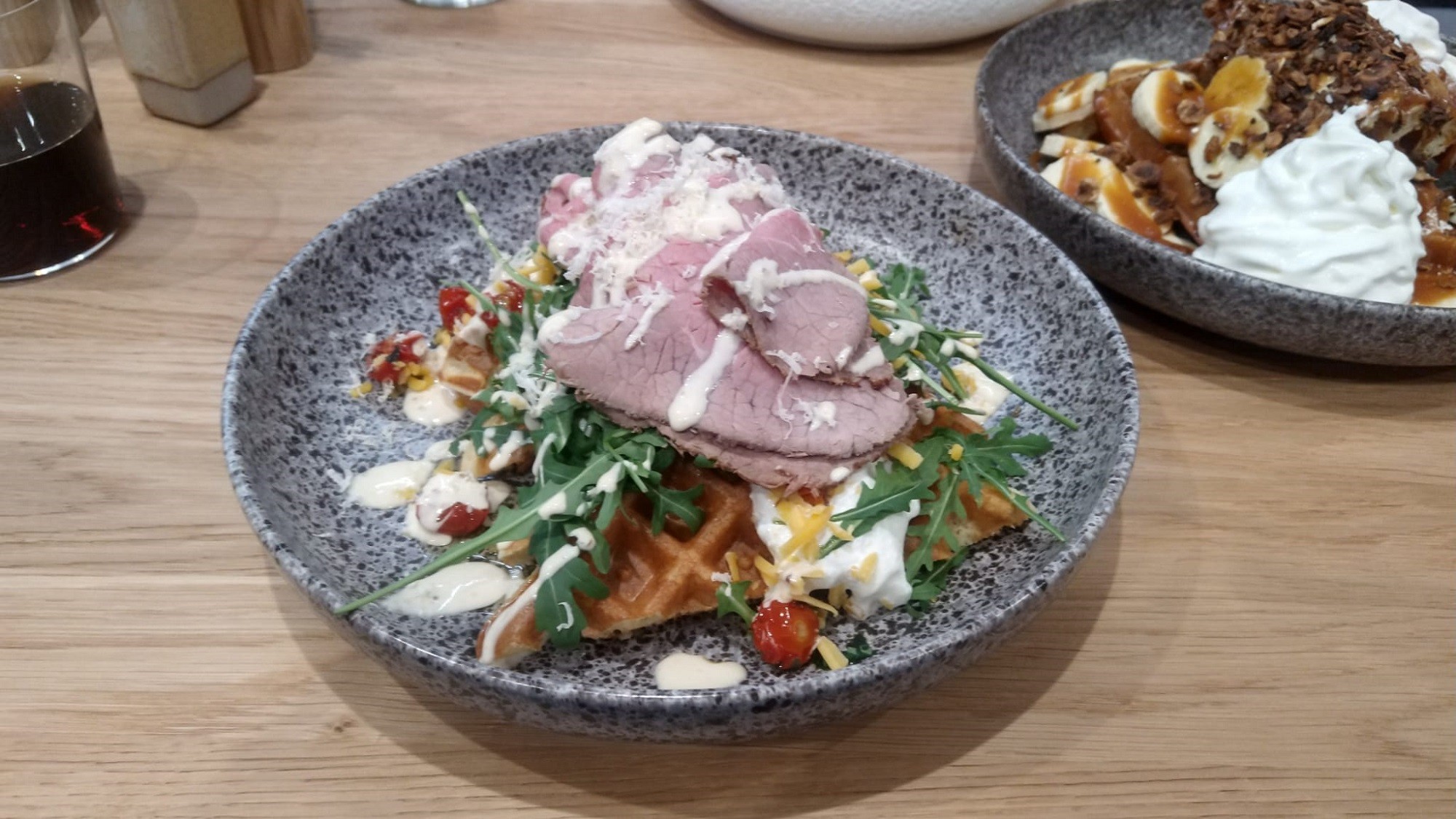Napokon sme si dopriali wafle, a to v slanej i sladkej verzii. Hoci patria k raňajkovej ponuke, nás zlákali práve na obed. Porcia Meat town waffle (12 €) podľa nášho odhadu uspokojí veľkosťou 90 percent jedákov. Páčil sa nám aj kontrast slanej chuti vyzretého syra čedar a plátkov jemného roast beefu so sladkou waflou. Krémová pena bola lahodne jemná a domáce sušené paradajky opäť famózne.