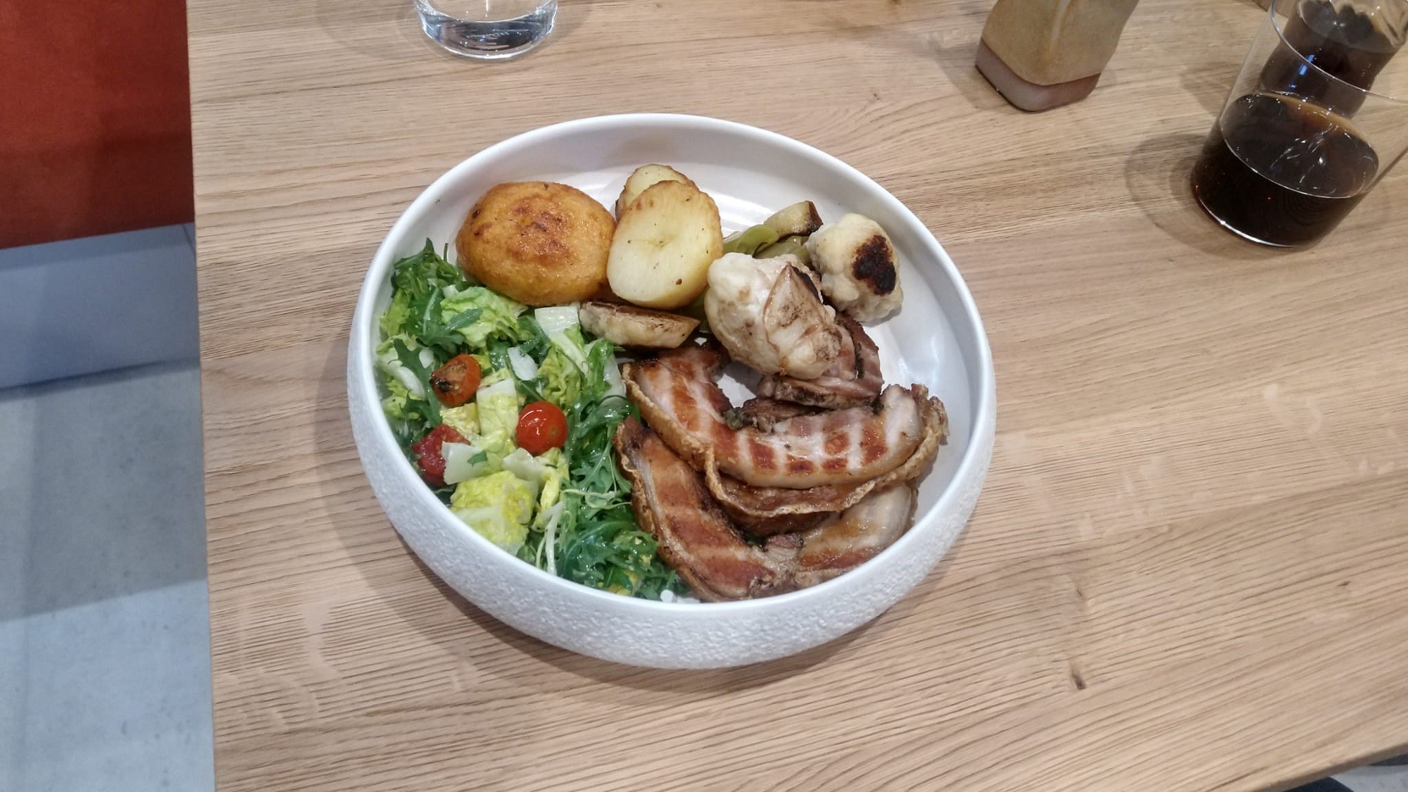 Ďalšou špecialitkou bol Pečený karfiol (8,90 €) s pohánkou, restovanou brokolicou, šampiňónmi a, ako inak, sviežim šalátom s domácimi sušenými paradajkami. Aj toto jedlo bolo ukážkou, ako vedia majstri kuchári čarovať s navonok bežnými surovinami. Jednotlivé sústa sme si naberali z rôznych strán misky, pričom sme zakaždým objavovali inú, často originálnu chuť - a všetky spolu dokonale ladili. Odporúčame vyskúšať aj tým, ktorí si myslia, že obed vo „vege“ štýle nie je celkom ono.