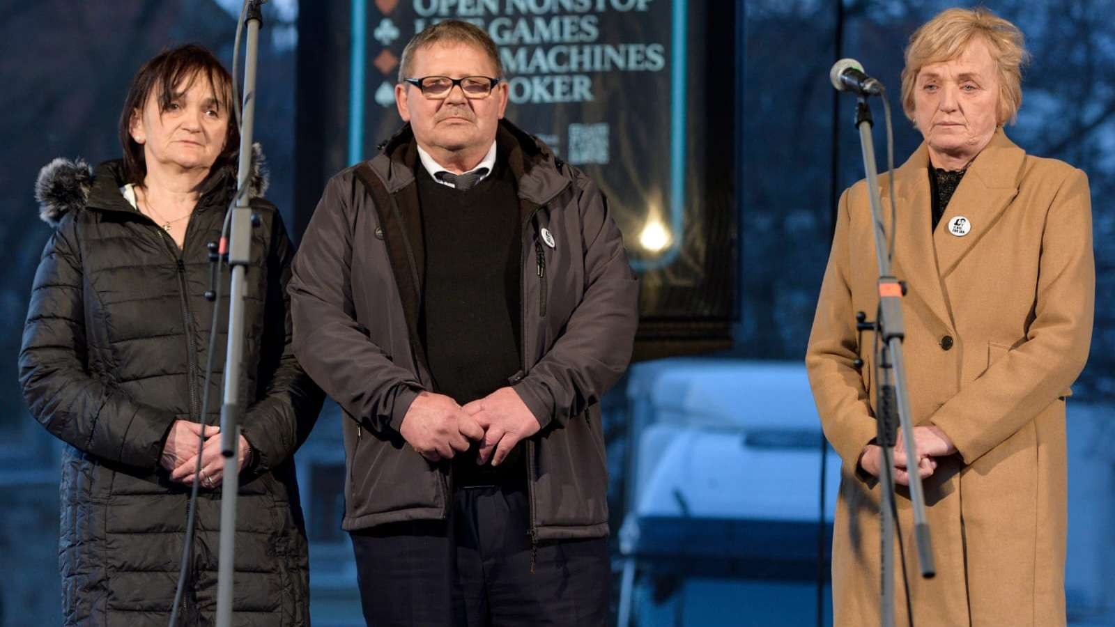 Jana Kuciaková, Jozef Kuciak, Zlatica Kušnírová počas zhromaždenia pod názvom Päť rokov bez Jána a Martiny na Námestí SNP.
