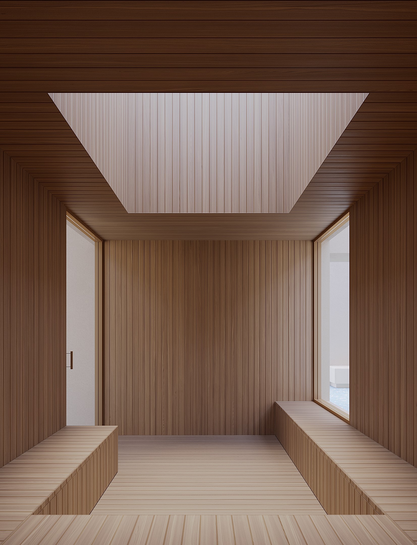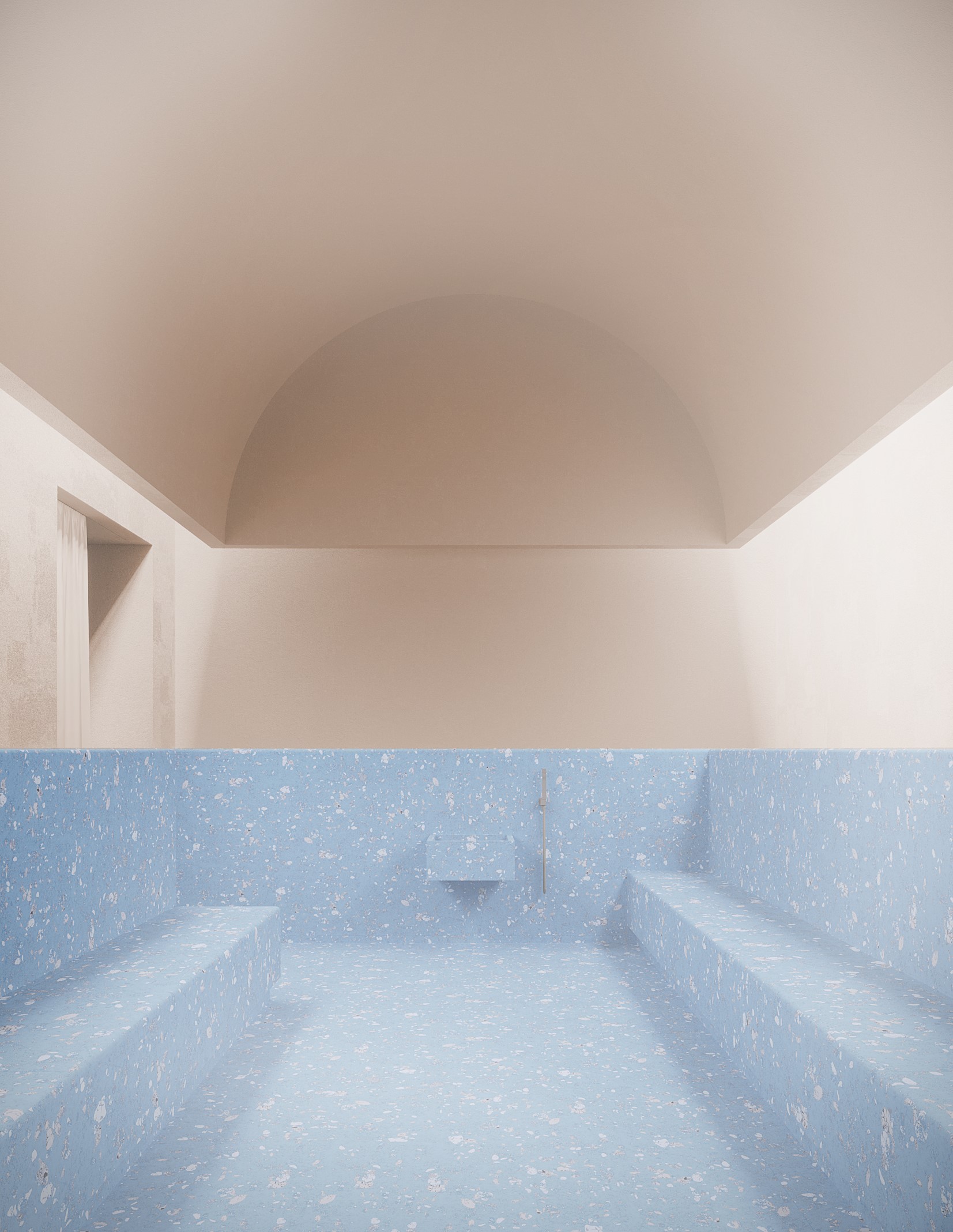 V blízkosti sedacích bazénov nájdu návštevníci parný kúpeľ. Vďaka tomu budú môcť absolvovať okruh, kedy sa najprv okúpu vo vnútorných bazénoch s 35, 38 a 40-stupňovou vodou a následne pokračujú do parného kúpeľa so 48-stupňovou parou. Po nej má nasledovať sprcha alebo ochladzovací bazén. Aj priestor parného kúpeľa je navrhnutý tak, aby kopíroval pozíciu pôvodného svetlíka. Architekti tu navyše navrhli zavesený oblúkový podhľad, vďaka čomu bude svetlo od svetlíka prechádzať po obvode sauny.