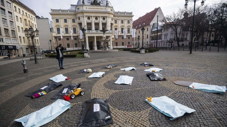 Inštalácia zobrazujúca telá detských obetí v piatok v Bratislave upozorňuje na potrebu pomoci Ukrajine. Pri príležitosti výročia začiatku vojny tak chce zdravotnícka humanitárna organizácia Magna poukázať najmä na ukrajinské deti, ktoré sú stále v ohrození.