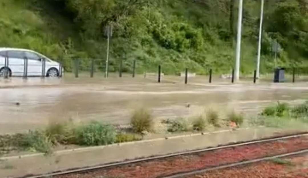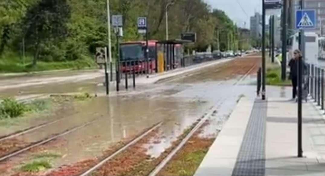 Zaplavená vozovka pri električkovej trati na nábreží.