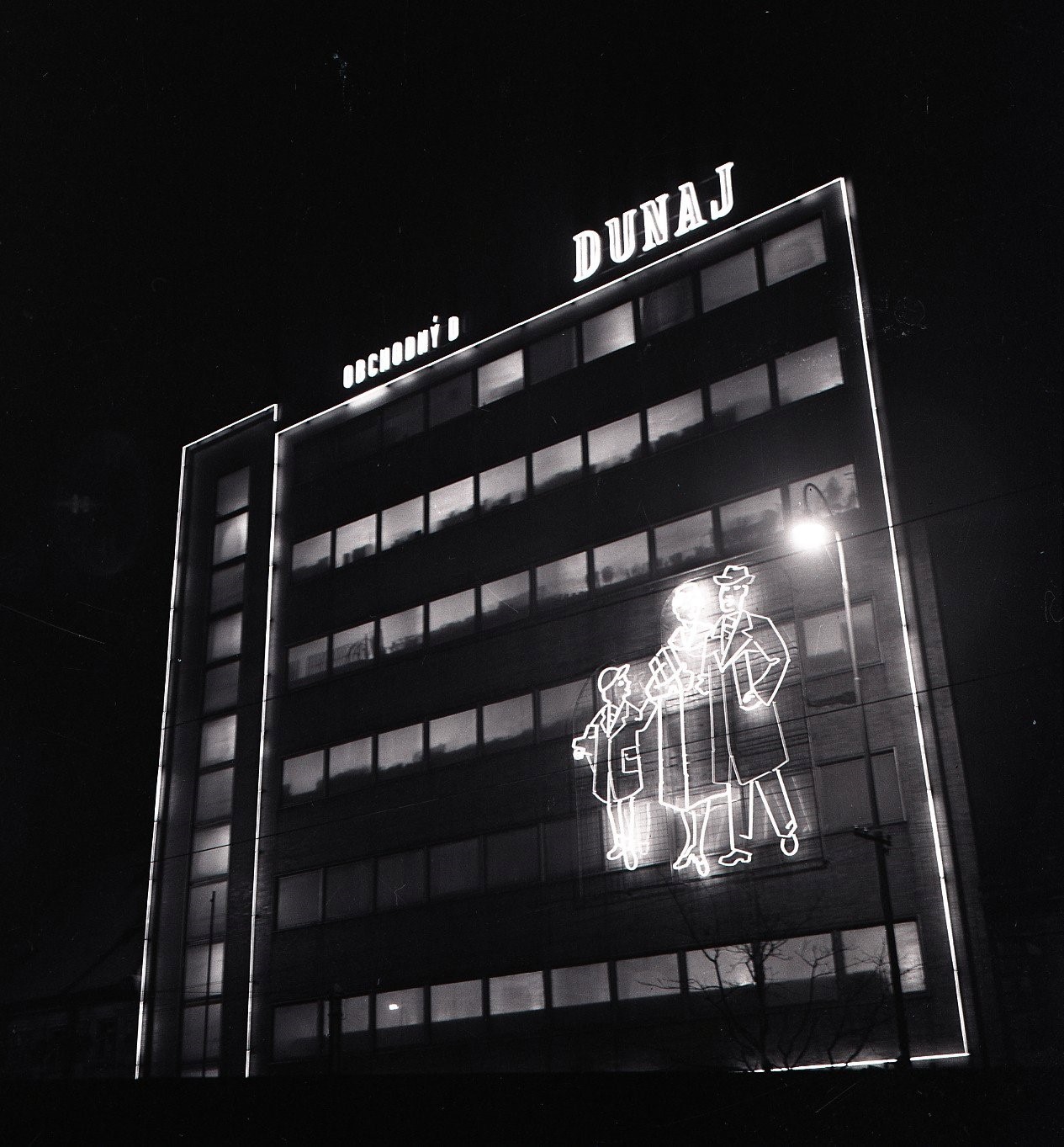 Január 1958: Dunaj s neónovou reklamou, ktorú sa poponáhľali dokončiť do začiatku ME v krasokorčuľovaní.