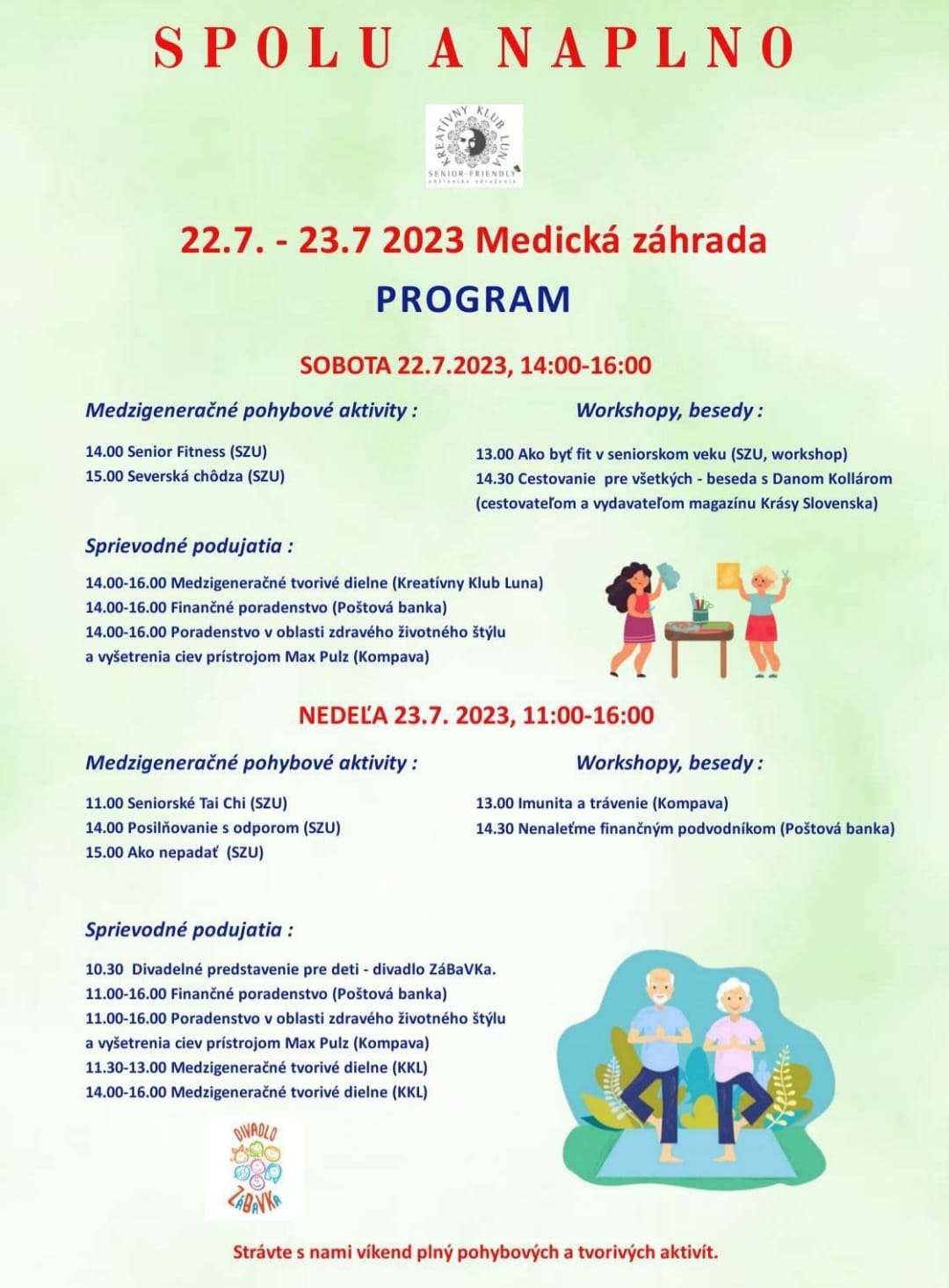 Medzigeneračné podujatie pri príležitosti Svetového dňa starých rodičov a seniorov. Čakajú vás pohybové aktivity so študentami fyzioterapie zo Slovenskej zdravotníckej univerzity, workshopy o trávení aj o tom, ako nenaletieť podvodníkom, cestovateľská prednáška, medzigeneračné tvorivé dielne. Pre malých návštevníkov je pripravené interaktívne divadelné predstavenie s pesničkami. Oslávte sviatok starých rodičov a seniorov s celou rodinou a strávte víkend plný pohybových a tvorivých aktivít. Organizuje Kreatívny Klub Luna.