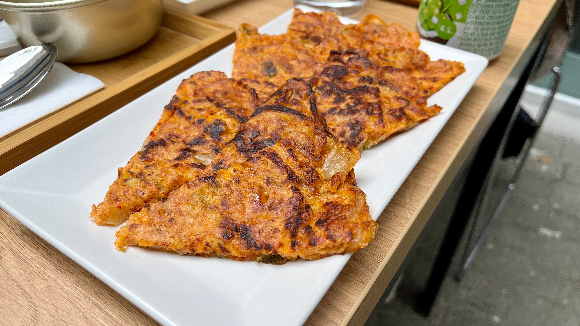 Čejuk / Jeyuk, v miskách sme mali okrem slanej placky kimči z pekinskej kapusty (hore vpravo) aj kimči z bielej reďkovky (nižšie).