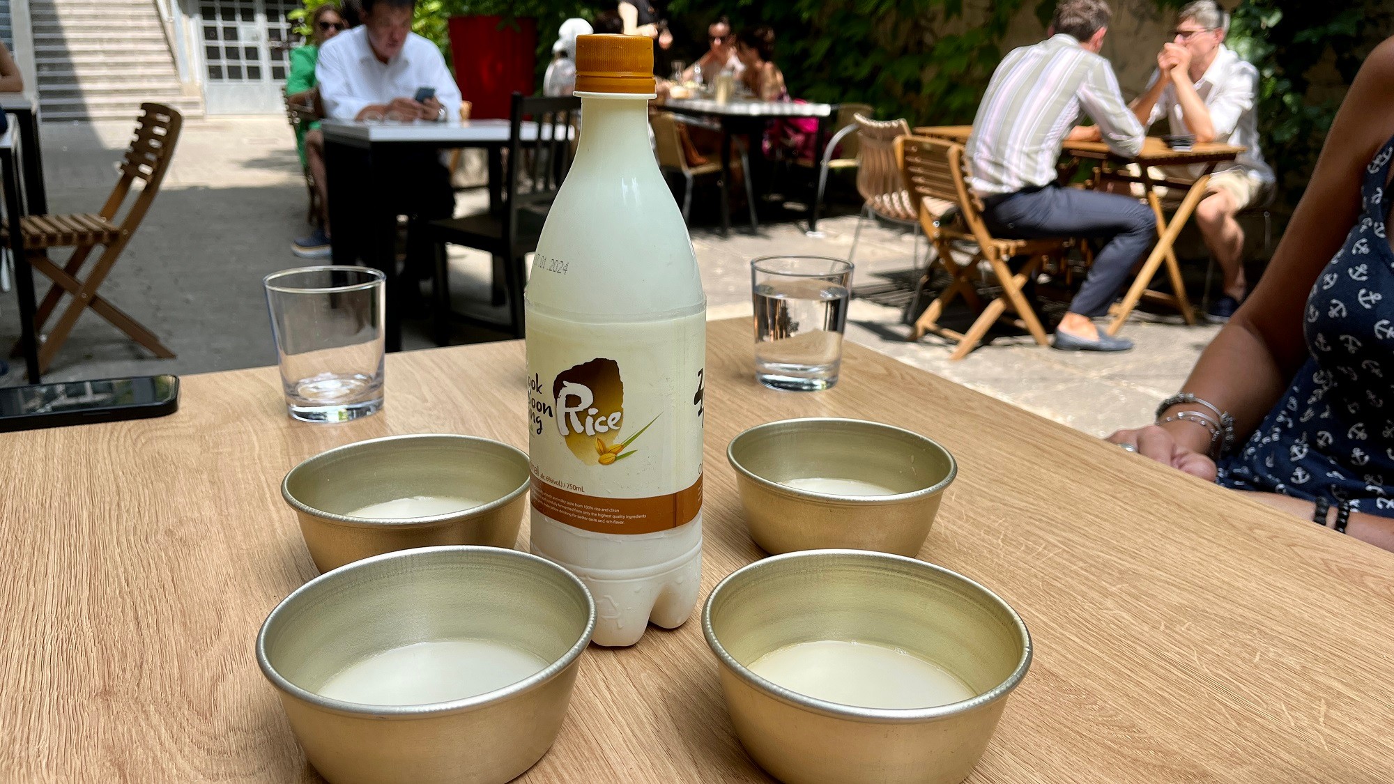 Najskôr sme však ochutnali ryžové víno Makgeolli (11,90 €), páčilo sa nám, že sa pije z kovových misiek. Bolo jemné, svieže a lahodne sladké, niečo ako ryžový burčiak. Ale opatrne, hoci obsahuje len 6 % alkoholu, aj po malom dúšku ho cítite.